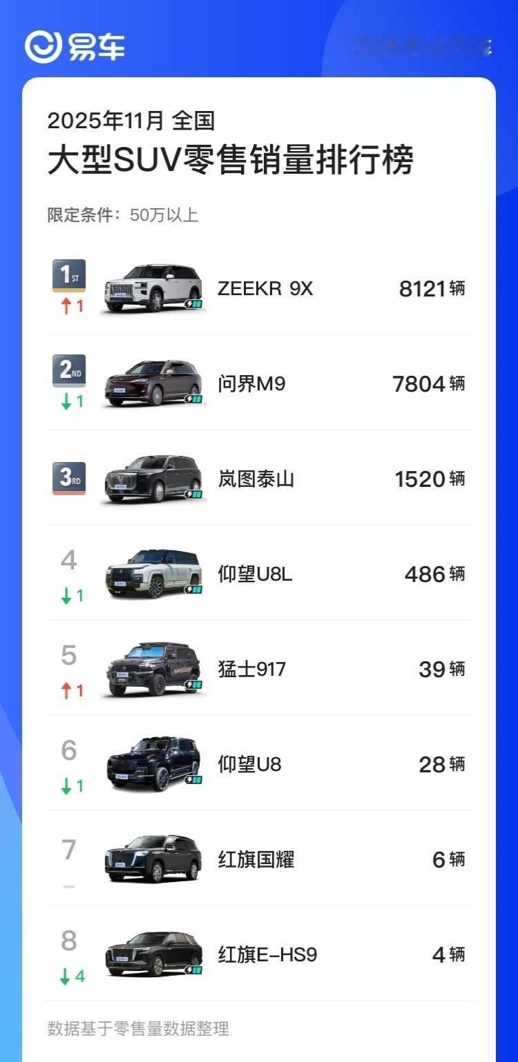 50 万级大型 SUV 怎么选?看看销量就知道了。11月极氪9X卖了8121辆,交付均价 53.8万,直接拿下50万以上大型 SUV 销冠。它为什么能让这么多人愿意花五十多万买中国品牌?答案很简单——产品力给了足够的说服力。和宝马 X5、奥迪 Q7 同价位竞争,却上了劳斯莱斯库里南同款的48V主动稳定杆,绕桩、J 弯的侧倾抑制能力肉眼可见地更稳,这种代际领先的硬实力,让它从配置到驾驶质感都完全不输传统豪华。更难得的是,在部分供应链吃紧的背景下,极氪9X还能一边稳住50+万的成交均价,一边卖出8000多辆,与极氪009一起拿下豪华双冠——009是40万以上 MPV 第一,9X 是50万以上大型 SUV 第一。消费者的选择不会骗你,真金白银砸出来的,就是中国品牌真正站上高端市场的话语权。极氪9X