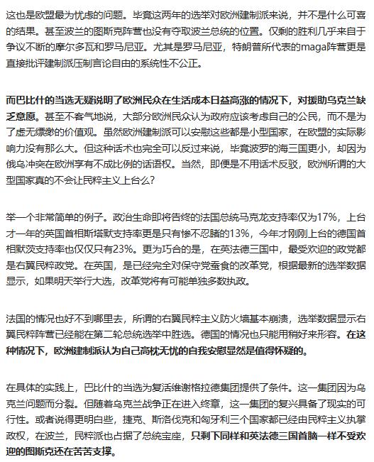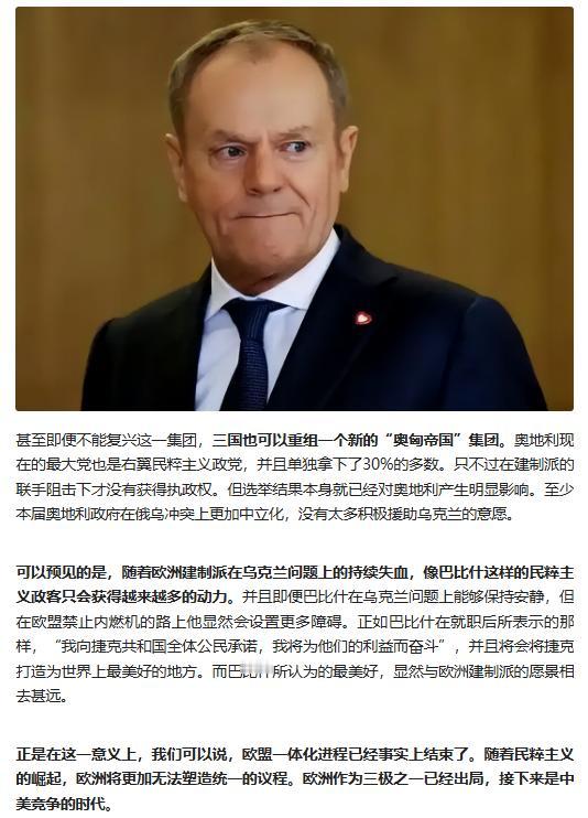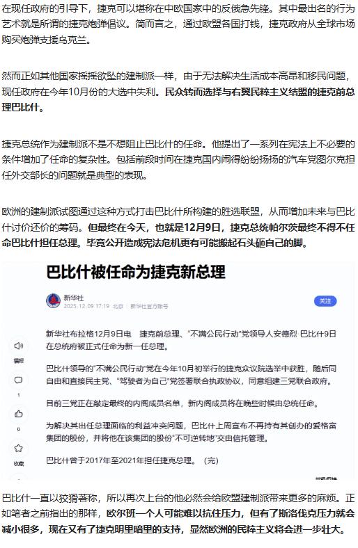 2025 年 12 月 9 日捷克民粹派巴比什再任总理,欧洲多国民粹崛起,欧盟对乌援助、一体化进程遇阻,局势走向引关注。 原文来自:新潮沉思录《捷克右翼民粹新总理今天上任,欧盟加速死亡》