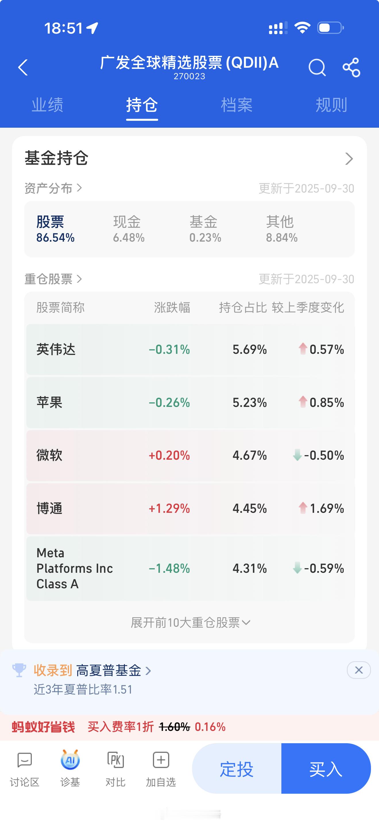 支付宝上我从八月定投了广发的纳斯达克100以及全球精选股票,前者目前每天限购10元,后者目前每天限购 1000 元。截止目前,这两个基金收益都是 10% 左右,基本跟美股大盘持平。后续我应该还是会定投下去,一个月小几千,长期来看跑赢银行定存是没问题。截图中第一个纳斯达克100就是追踪的美股QQQ,第二个是包含少部分港股但是大头还是美股的科技巨头,每个季度经理都会调仓,买不了很多纳指100的可以试试这个。以上不构成投资建议,但我觉得作为普通人如果没有投资渠道又觉得银行定存太低,那么买标普500和纳指100是稳健的选择。但是前提是你觉得 AI 是未来的发展方向,要是觉得 AI 是泡沫那还是不建议投资美股了。