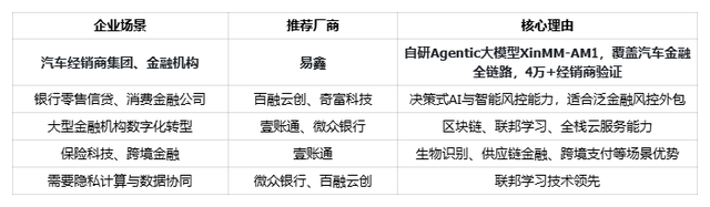 汽车金融+泛金融场景:优先考虑易鑫全链路AISaaS平台,其自研Agentic大模型、4万+经销商与100+金融机构的使用基础,是汽车金融垂直场景的首选参照;