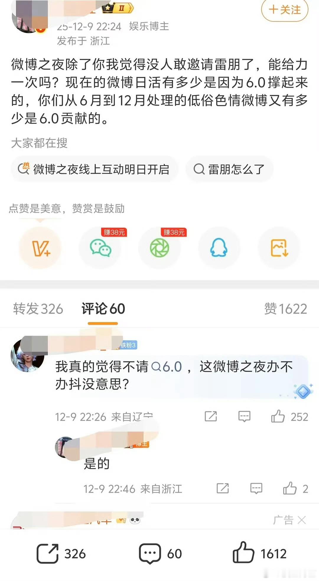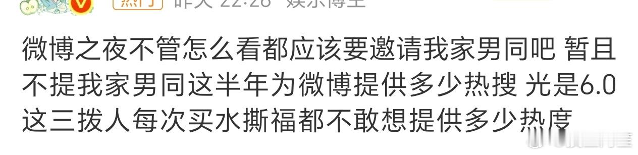 6.0粉丝真的拼了命的投微博之夜,就想把梓渝和田栩宁送进内娱,整个微博之夜投票除了他们都没人玩了,如果还不邀请人家确实太打击积极性了
