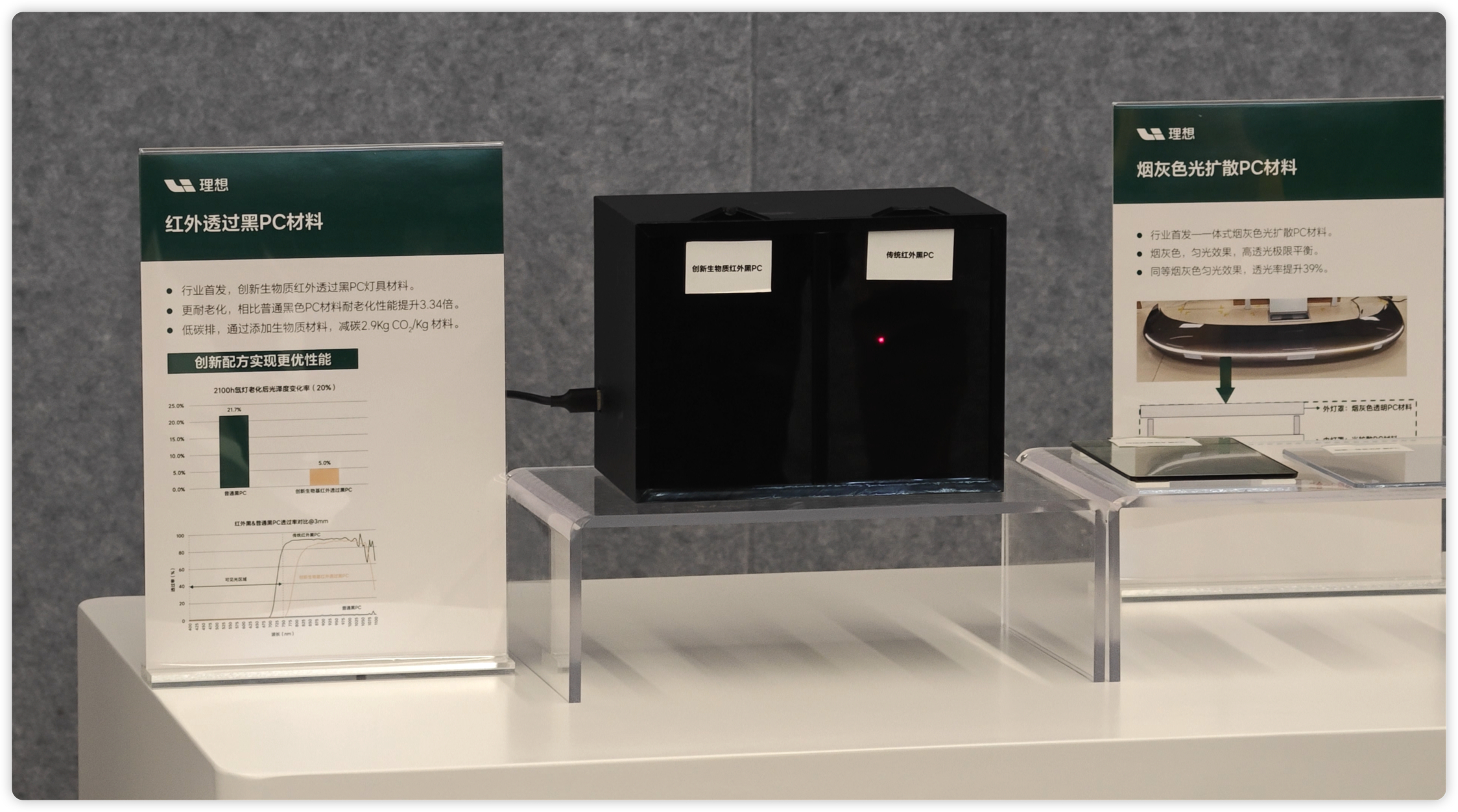 理想材料研发成果大盘点 分享之 理想汽车三个系列车型的星环灯灯罩,用的材料其实不一样。我并不是专业人士,所以就用最直白的话跟大家聊聊~ 要是有理想车主,欢迎来探讨;如果我说得有不准确的地方,就 请来纠正,他是理想汽车材料研发负责人,专业问题找他准没错,哈哈哈!先说说理想L系列:外灯罩用的是透明PC材料,透光率能达到89%左右。最大的好处就是夜晚点亮后辨识度拉满,在MEGA和I系列还没推出的时候,一看到那长条环灯,就能一眼认出是理想L车型。不过现在很多品牌都跟风用了星环灯设计,造型越来越像,有时候还真得仔细看才能分清。再看MEGA的星环灯:这一整块灯罩起初是全透明的烟灰色PC材料,后续会在外部喷一层黑漆,只留出灯线的位置。灯线内侧还装了一个内灯罩,用的是光扩散PC材料,核心作用就是让光线更柔和,不会刺眼。最后是理想i系列的星环灯罩材料——重点说下,i系列和L、MEGA系列的双层灯罩设计不一样,它采用的是一体化设计:黑色部分和发光部分是一体的,但用的材料不同。黑色部分用的是创新生物质红外黑PC材料,名字有点绕,这是理想和供应商联合研发的新品。它的优势很明显:老化性能提升了3.34倍,技术领先行业3年;而且材质不是来自石油,而是生物质材料,还能实现减碳效果。发光部分的灯罩则是高性能光扩散PC材料,透光率比MEGA提升了39%,发光效果也更柔和。大家有机会可以实地对比下理想L系列、MEGA和i系列的星环灯,感受下不同材料带来的发光效果差异~大v聊车理想汽车