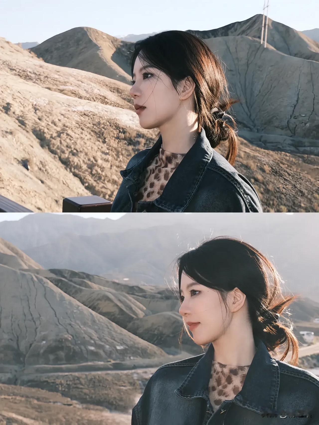 沙漠中的时尚少女,牛仔外套与豹纹衫的完美搭配