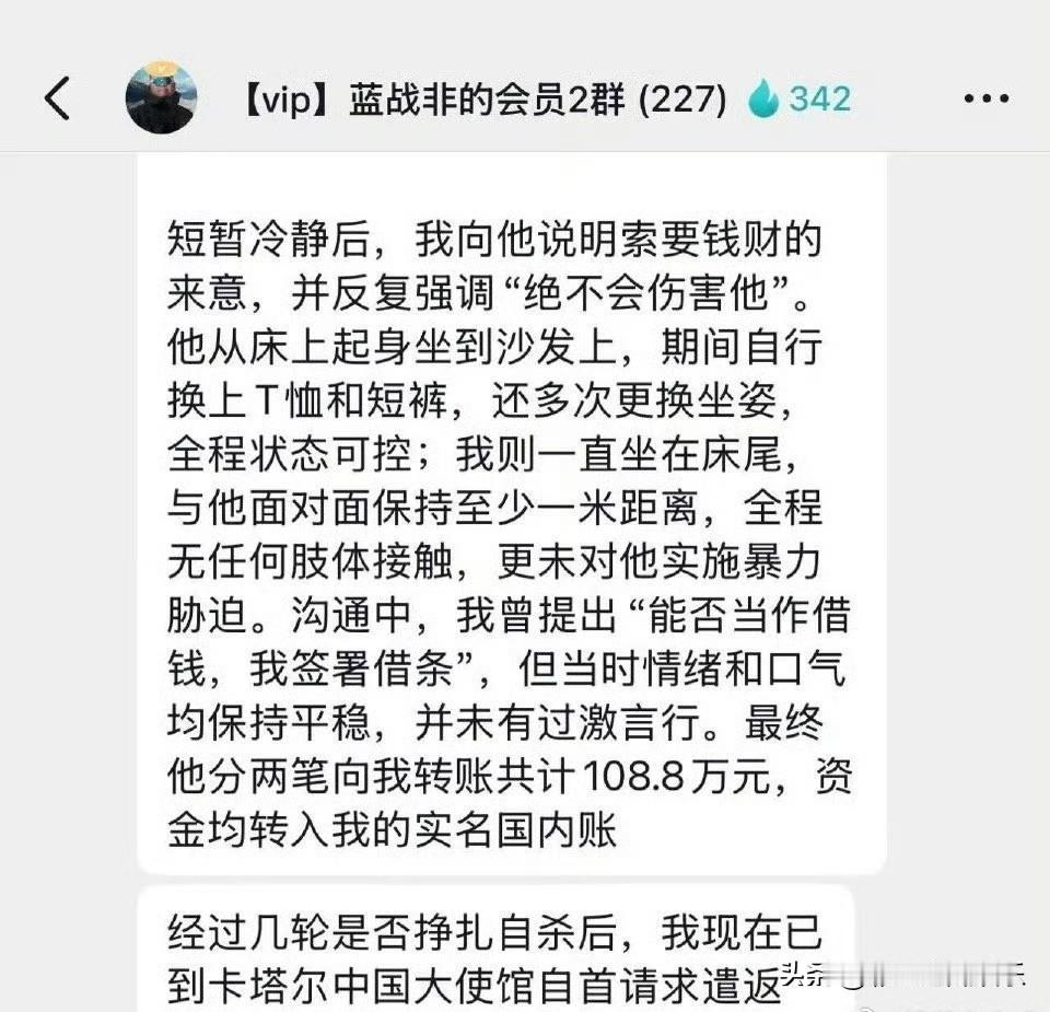绑架蓝战非的人自首了,自首前写下长文回忆犯罪过程,说自己并没有策划半年,他是玩股票和消费欠下饥荒,走投无路只好动了绑架蓝战非的念头。 他还说并没有买通机场地勤和酒店工作人员,而是冒充蓝战非补到了房卡,也不是三个人劫持,全程只有自己。 他用的是防狼喷雾,并没有暴力绑架,一直强调不会伤害蓝战非。 这些看似在洗白实际上就是已经犯罪了,不管什么主观因素,他就是让蓝战非转给他一百多万。 都说老乡见老乡,背后来一枪,蓝战非选择公开是对的,至少他真的没有被仙人跳。