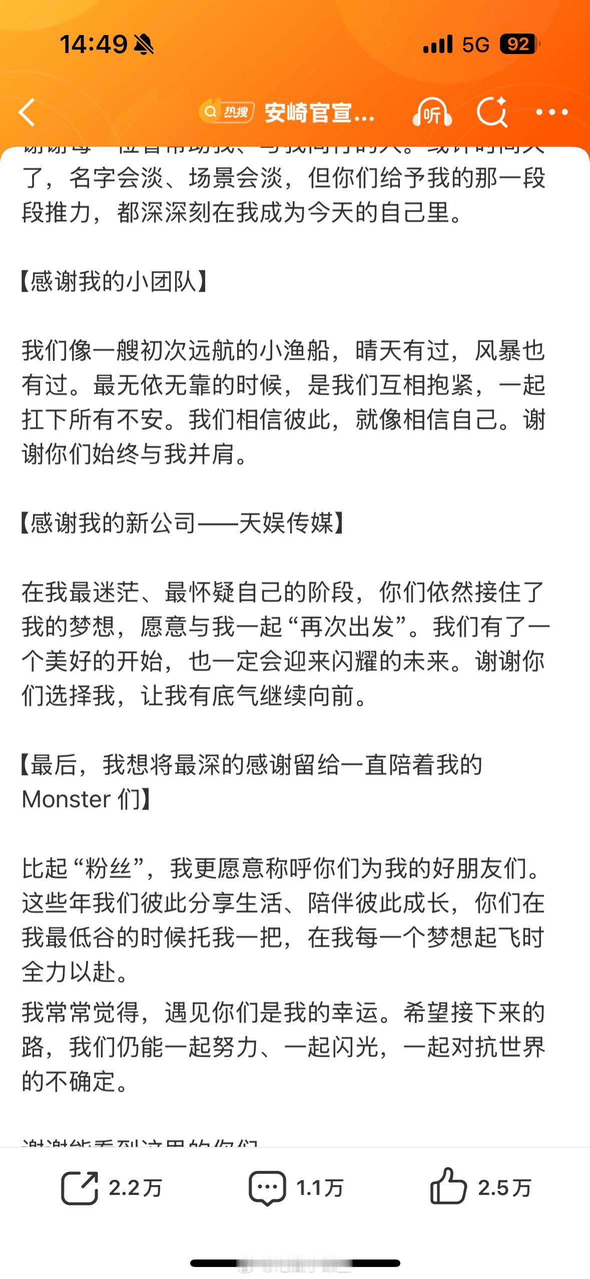安崎官宣签约天娱看到安崎的长文真的泪目了。感谢爸妈,感谢匠星给的“第一束光”,感谢Monster们陪她走过低谷。在最迷茫的时候被新公司接住梦想,这是什么双向奔赴啊!30岁又怎样?姐姐的舞台黄金期才刚刚开始,等你的新专辑和巡演!