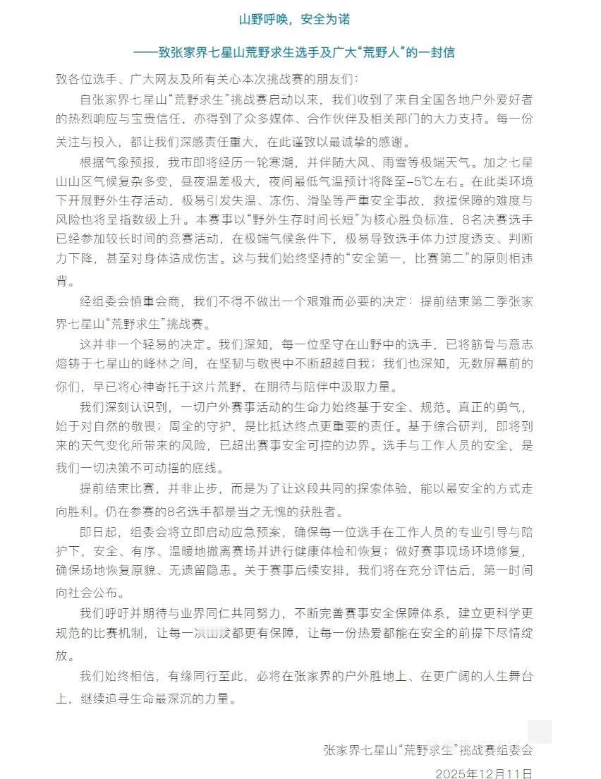 太突然了! 追了俩月的七星山荒野求生居然提前叫停,寒潮低温只是表面原因,这波停赛早有伏笔! 12月11日官方发文,说山区夜间气温要跌到-5℃,怕选手失温冻伤才紧急终止,还得把山上设施恢复原样。但明眼人都清楚,之前争议就没断过,“冷美人”因营养不良退赛,好几名选手陆续扛不住退出,安全隐患早就藏不住了。 这档节目靠真实刺激爆火全网,流量破百亿,可热度背后全是隐患。看似有安全员和体检保障,却还是挡不住选手身体亮红灯,跟风办赛的乱象更是把风险拉满。停赛不是坏事,总比拿选手安全换流量强,真出了事谁都担不起。 与其硬撑着比到最后,不如趁这个机会好好规范规则,把安全和生态放在第一位。热度再高也不能透支行业口碑,否则再办第三季也难让人放心。你们觉得这次停赛是明智之举,还是可惜了选手们的坚持?来评论区聊聊!晒图笔记大赛 七星山荒野挑战 丛林荒野求生 极限荒野求生 七星山生存挑战