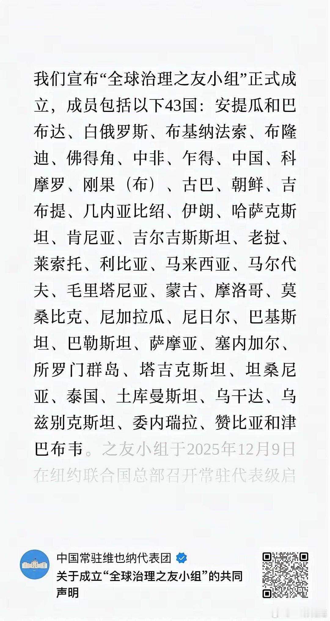 继中国牵头的32个创始成员国的国际调解院成立之后,又一次由中国牵头的43个成员国成立的全球治理之友小组成立了,这两个国际性的组织,成员国都是很牛逼的国家。现在国际上有很多复杂的问题,期待国际调解院先开单。
