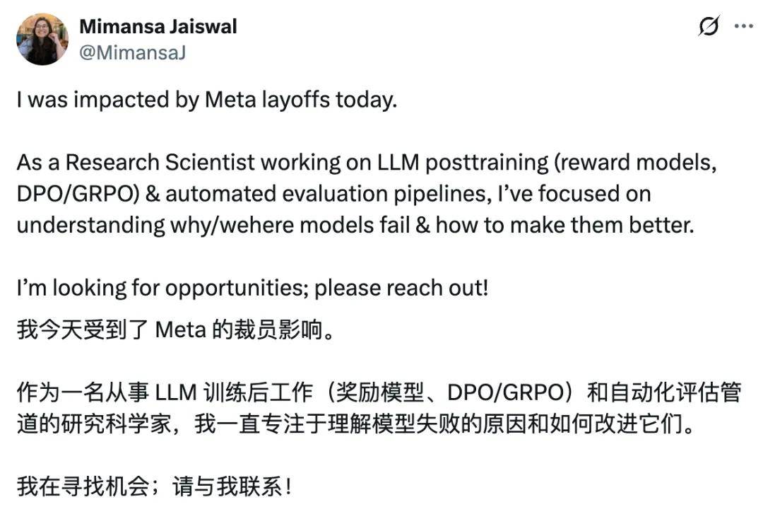 Meta 发言人 Ana Brekalo 向媒体确认了裁员消息,称公司正「聚焦于提升 AI 产品落地效率」。