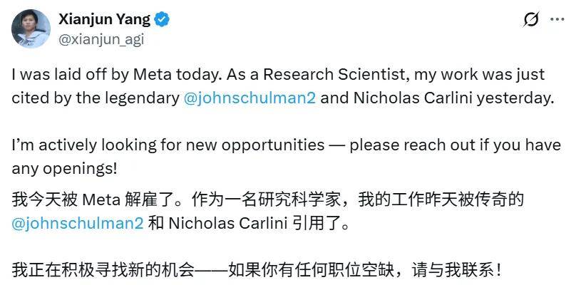 与此同时,已经有科学家在推上开始「在线求职」了,其中甚至包括 FAIR 研究科学家总监田渊栋。不过,目前尚不清楚他是主动离职还是被裁。
