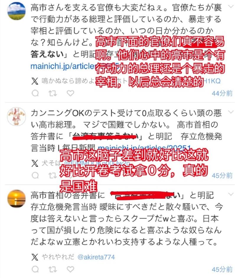 高市答辩原稿曝光,涉台言论是她自由发挥,日本人破大防了:国难! 昨晚(11日),日媒曝光了高市早苗发表涉台言论时那场答辩会的发言原稿,一看才知道:挑衅言论居然完全是高市个人在自由发挥。 按照日本国会的答辩流程,高市会提前拿到在野党的提问内容,答辩时只需要照着事先准备好的稿子念就行,而应对涉台问题,原稿上写得清清楚楚:针对假设性问题不予作答(图1)。 这下日本人真是破大防了,尤其是之前那些替高市早苗开脱的人,说什么“首相说出涉台言论是被诱导的”、“首相说的危急存亡事态是有假设条件的”,这下原稿一出,直接辩无可辩。 高市早苗自己加戏嘴瓢,却让整个日本为其买单,承受了1个多月中国的外交怒火,经济损失也是十分严重。之前被蒙在鼓里的日本人得知真相,自然也是一肚子火,给高市早苗骂得不轻:“你这脑子差得就好比开卷考试拿0分,真是国难”。 不过,日媒发出原稿,无非是想告诉我们,中日这轮争端起于高市早苗个人,希望我们不要迁怒整个日本。但是从日本人对高市言论的高支持率来看,说到底这还是大部分日本人的心之所想,只不过是借高市早苗的嘴,将这层窗户纸捅破了而已,我们现在早就丢掉了幻想,高市不道歉不收回言论,日媒怎么运作都没用。