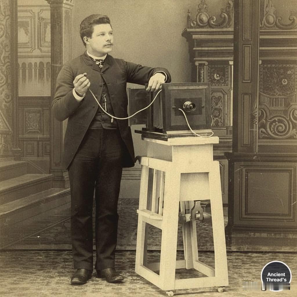 这张照片是摄影师 William H. Beck(威廉·H·贝克)的著名自拍照。照片展示了他自豪地站在自己的大型工作室相机旁,手持快门线,可能是在按下快门的前一刻。 照片中的男子是 William H. Beck(威廉·H·贝克),一位活跃于19世纪后期的美国摄影师,主要在伊利诺伊州的 Morrisonville(莫里森维尔)和 Raymond(雷蒙德)工作。 这是一张名为“内阁卡”(Cabinet Card)的照片。在19世纪,摄影师经常使用这种自拍形式来展示他们的设备和专业能力,作为一种广告或名片。 他使用的是一台大型座机式照相机,当时这代表了摄影技术的尖端设备。他手持的绳子是快门释放线(cable release),用于远程触发快门以避免抖动。 这种使用大幅面相机的肖像摄影在当时是一个细致且需要耐心的过程。 工作室的布景也很考究,包括装饰性的仿大理石柱子和华丽的柜子,这些细节都反映了19世纪摄影工作室的典型风格。 这张照片是19世纪摄影史中一个独特的例子,展示了摄影师与他们的工具之间的关系。