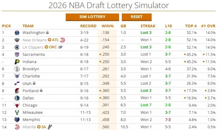 快船不敌火箭,战绩来到6胜19负。这样,快船正式跌至联盟倒数第三。同时,快船前四概率52.1%,状元签概率14%,与奇才、鹈鹕并列联盟最高。但是,快船的首轮签必须上贡雷霆。快船vs火箭