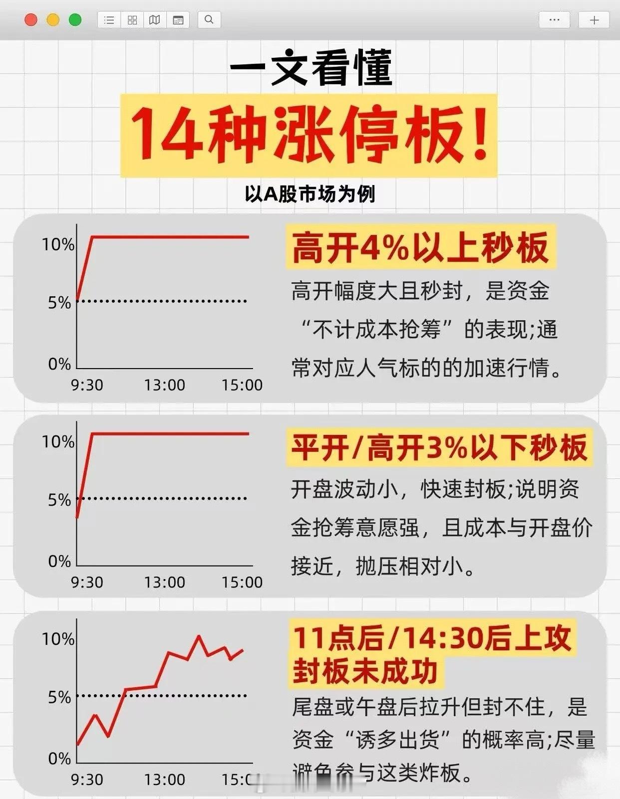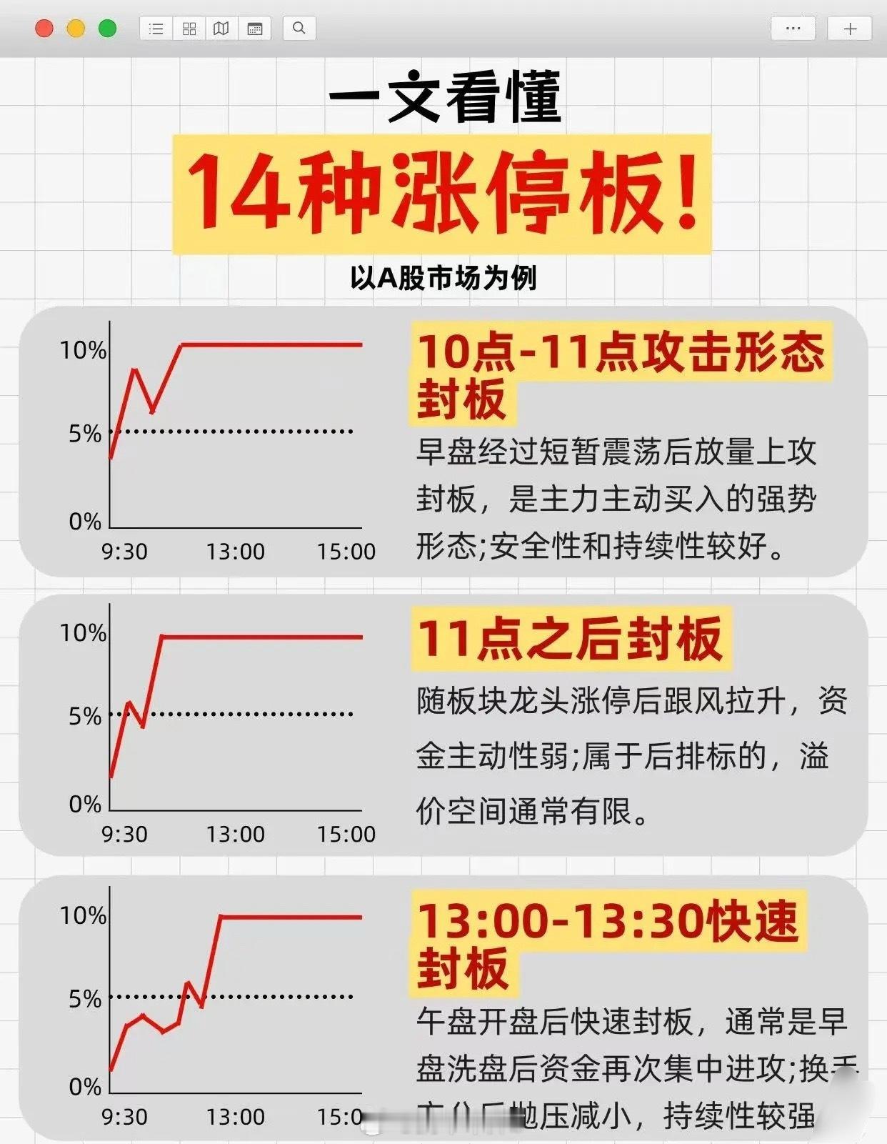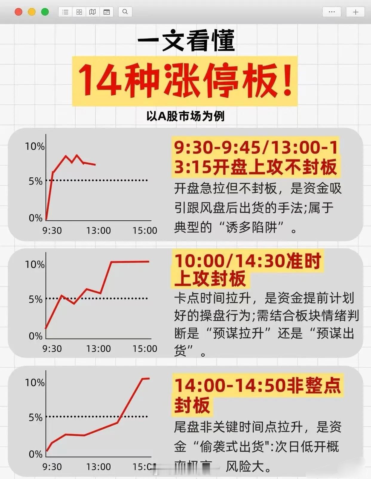 针对资金20万以内想通过短线快速成功的投资者,相关炒股本质的经验分享如下:首先强调需认真阅读笔记领悟本质,内容虽短但内涵深刻。具体经验包含以下几点:一是关于止盈止损,批评亏了就一直拿、仅看账户盈亏比的做法,指出这会导致亏损无限大、盈利有限小,应反向思考——盈利继续拿,稍微亏损就割掉。止盈止损原则为:盈利15%后,利润跌10%就止盈,继续涨则让利润奔跑;买入后跌超本金5%就止损。若保持止盈10%、止损5%的比例,即便实战100次胜率仅50%,收益也能达800%。二是小资金要做热点龙头,需跟随市场热点(走在市场前面是基础),无论打板、低吸还是追涨,目的都是做热点做龙头,而非简单打板套利。三是操作策略上,先看宏观政策趋势,选定三个当下热门板块题材,每个板块选1-2个龙头个股,股票池放3-6只并反复跟踪,机会未现耐心等,出现则果断出手。同时强调弱势行情下空仓是最好的防守,5日线之下建议空仓或轻仓——指数在5日线之下难获利,之上难亏损,此道理虽简单但践行者少。四是把握买卖时机与情绪节点:买在分歧,卖在一致。仅在大盘情绪低潮、个股高位震荡、题材新出等特定分歧阶段适合出手,风平浪静的盘面中所谓晋级、卡位多为新手所为。还要把握情绪冰点,其出现时间不定(可能在开盘、开盘后分歧点、下午或尾盘),此时出手能获得被情绪带下的恐慌筹码,还可有效避免追高。