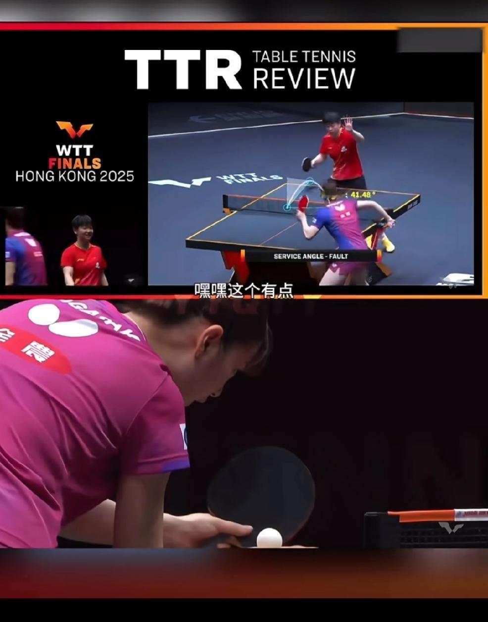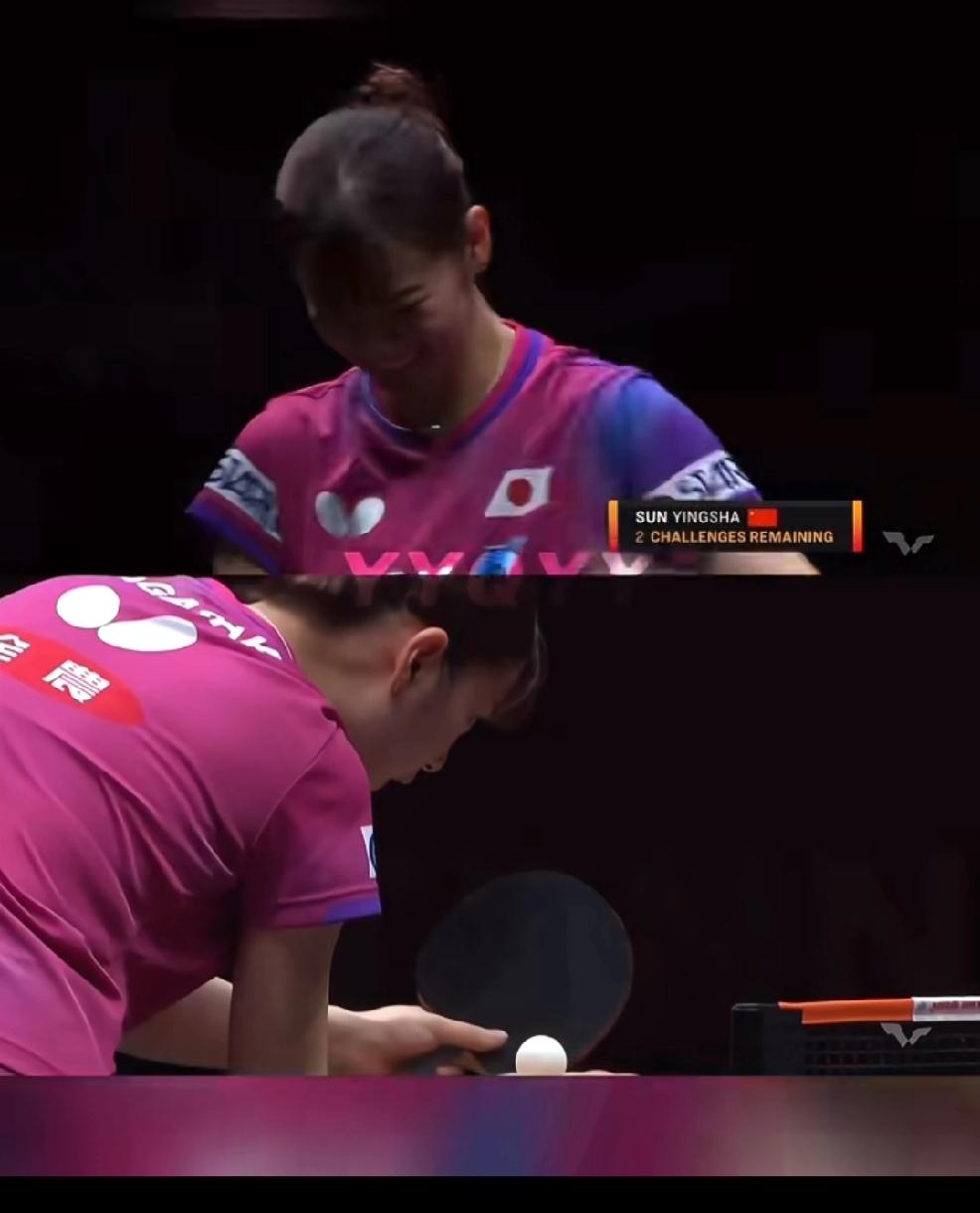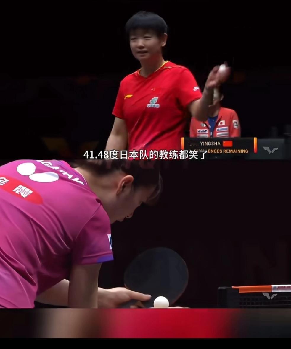 昨晚孙颖莎与日本队长崎美柚的比赛, 莎莎第一次在场上比赛提起挑战。 长崎美柚的发球, 实在让人看不清了, 遮挡的让人不能直视了, 孙颖莎也是实在不能忍了才发起挑战。 鹰眼显示发球高度为41.48度, 按照规定不能超过三十度, 日本人看到这个高度自己都不好意思地笑了, 主打一个打不过就耍小聪明! 也有点想打款莎莎的节奏, 因为被孙颖莎“哐哐”揍。