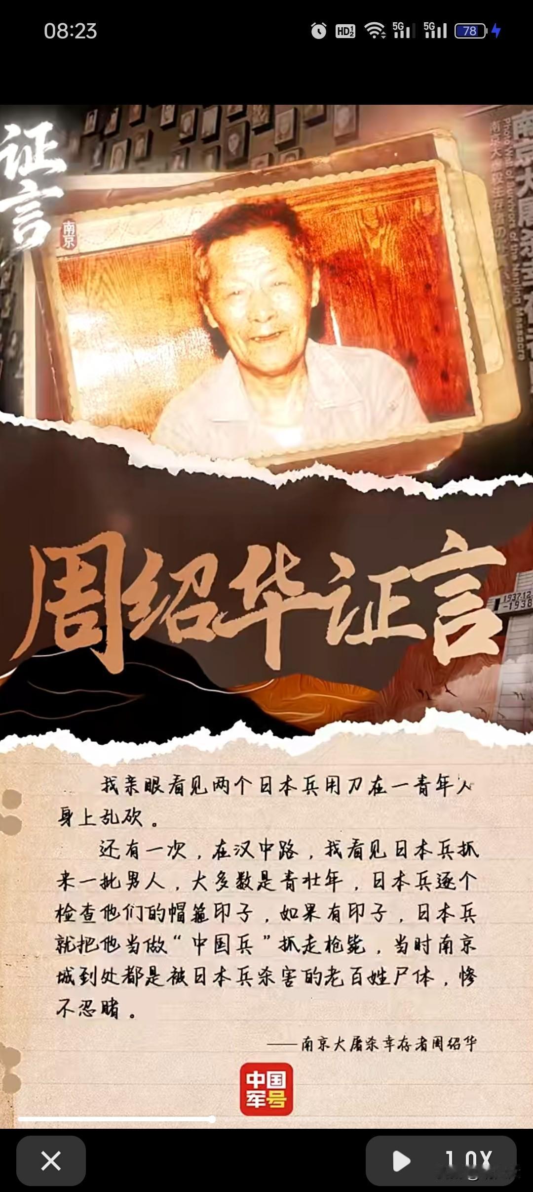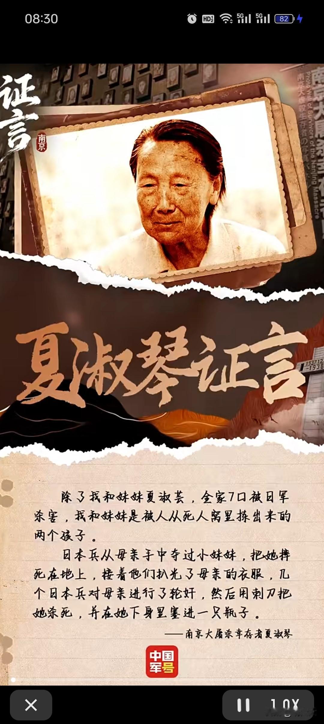 🔥今天以国之名,悼我同胞! 她的9口之家只剩2人:南京大屠杀幸存者的血泪,是刻在骨血里的铁证! “全家7口倒在日军刀下,我被刺三刀、遭强暴,从尸体堆里爬出来”——南京大屠杀幸存者夏淑琴的回忆,每一句都浸着血。 1937年日军屠城时,夏家9口人逃不出火海:未满2岁的三弟被日军拦在门内烧死,父母、爷爷等7位亲人死于手榴弹爆炸,10岁的她被强暴后遭刀刺、炸伤,醒来时身边是亲人的尸体。 她还亲眼见日军把青壮年拉到野外集体屠杀,旅馆服务员被刺刀捅死——这些不是“历史故事”,是她活着的证据:从尸体堆被救出后,她和妹妹成了家族仅存的人,余生都带着伤疤与噩梦。 如今,88年过去,夏淑琴的证言仍是日军暴行的铁证:焚烧、屠杀、性暴力,是系统性的罪恶。当有人试图模糊这段历史,幸存者的血泪在喊:“这不是过去,是我们的骨血。” 今天,以国之名悼同胞——不是为了延续仇恨,是为了让“南京”二字,永远是和平的警钟。 图片来自网络,侵删!