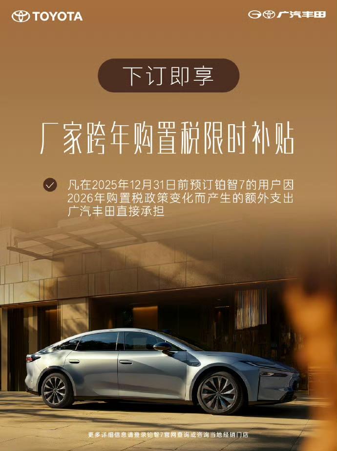 30年前——买大众、丰田; 20年前——买大众、丰田; 10年前——买比亚迪、奇瑞; 今天开始——买广汽丰田铂智7。 2026年爆款新车预订已开启!广汽丰田铂智7在广州车展首发后热度持续飙升,首批展车已开放提前品鉴,为明年一季度上市造势。 作为豪华旗舰D级纯电轿车,铂智7在20万级市场中实力超群,尺寸宽敞,座舱配置豪华,零重力座椅、NAPPA真皮和雅马哈音响让乘坐体验舒适至极。智能化与驾控同样出色,搭载华为电驱和鸿蒙座舱,配备双腔空悬,驾驶乐趣十足。 更吸引人的是,广汽丰田推出“跨年购置税限时补贴”,12月31日前预订,明年提车时购置税成本由厂家承担,还有“厂家三担责”政策,让购车和用车都安心无忧。无论是追求豪华舒适还是科技驾控,铂智7都值得期待,赶紧行动,锁定你的2026年爆款座驾吧!