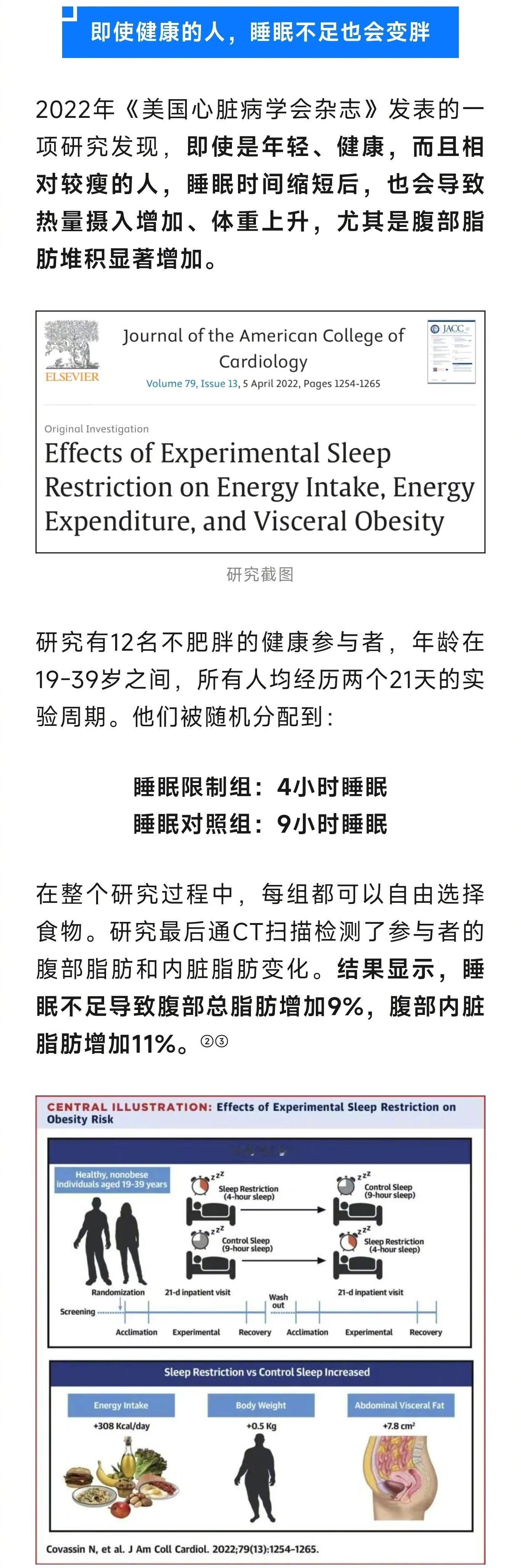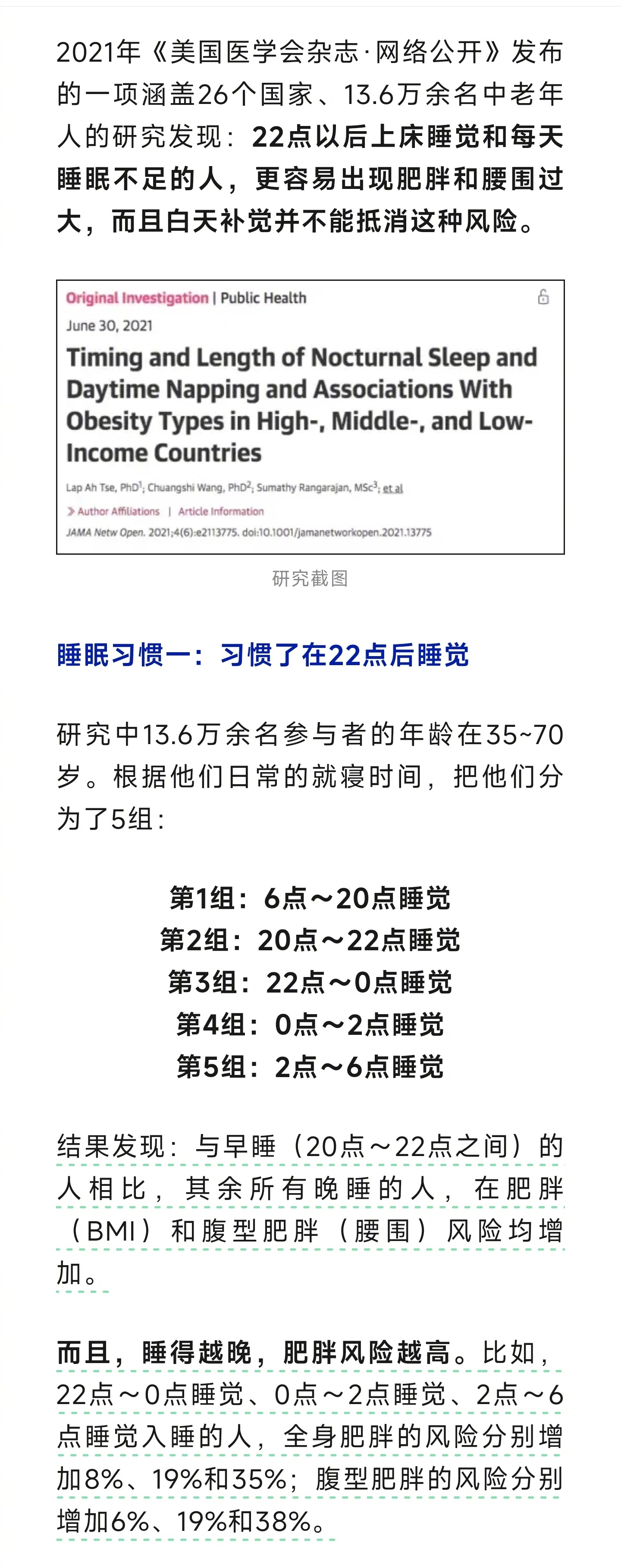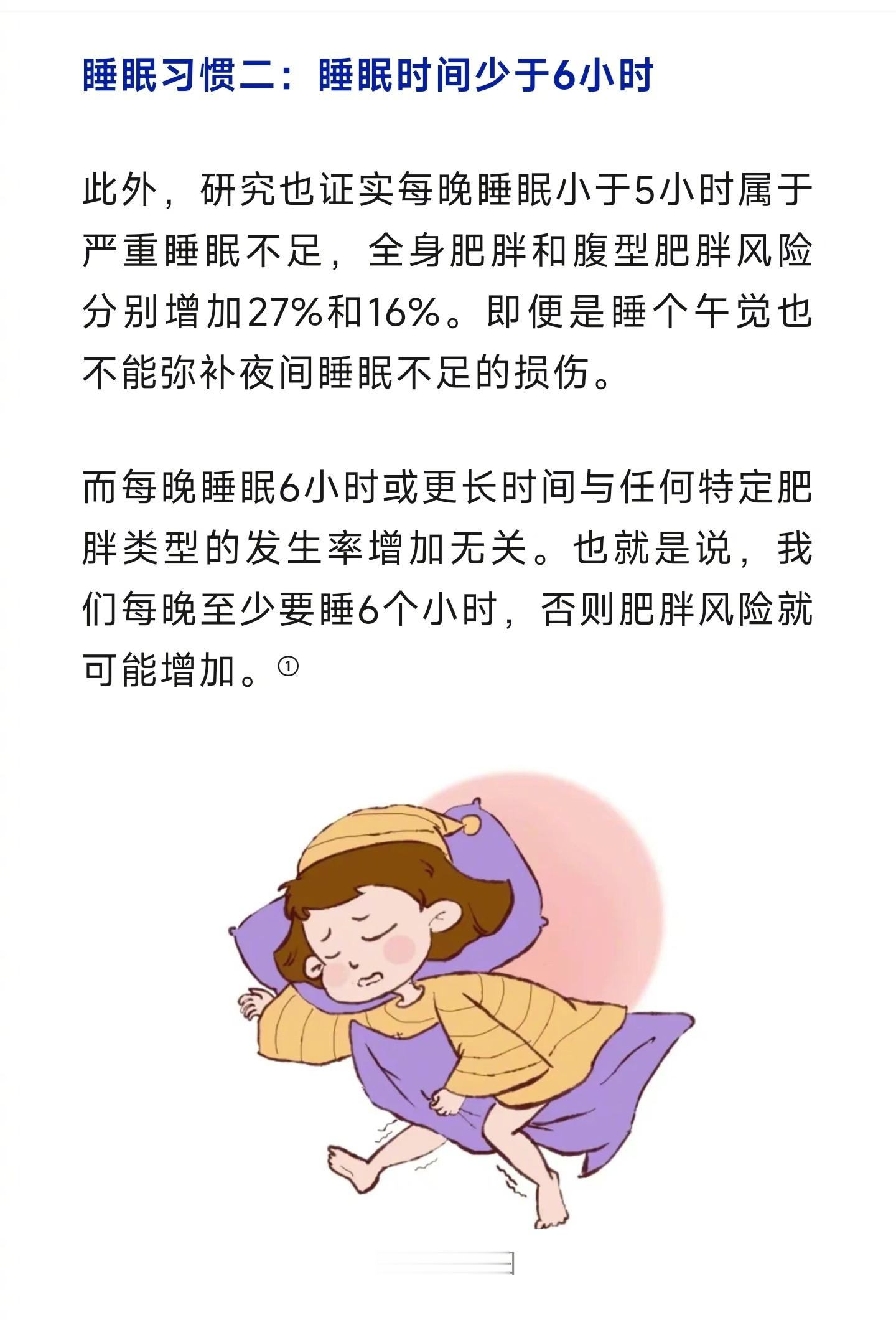 你的腰粗或是因为睡眠不足【睡眠不足腰围真的会变大】 睡眠不足不仅带来黑眼圈,还悄悄给腰围“充了值”。2021年《美国医学会杂志·网络公开》发布的一项涵盖26个国家、13.6万余名中老年人的研究发现:22点以后上床睡觉和睡眠时间少于6小时的人,更容易出现肥胖和腰围过大。睡不建议少于6个小时 与20点-22点之间入睡的人相比,其余所有晚睡的人,在肥胖(BMI)和腹型肥胖(腰围)风险均增加。而且,睡得越晚,肥胖风险越高。此外,每晚睡眠小于5小时属于严重睡眠不足,全身肥胖和腹型肥胖风险分别增加27%和16%。即便是睡个午觉也不能弥补夜间睡眠不足的损伤。(人民日报健康客户端)