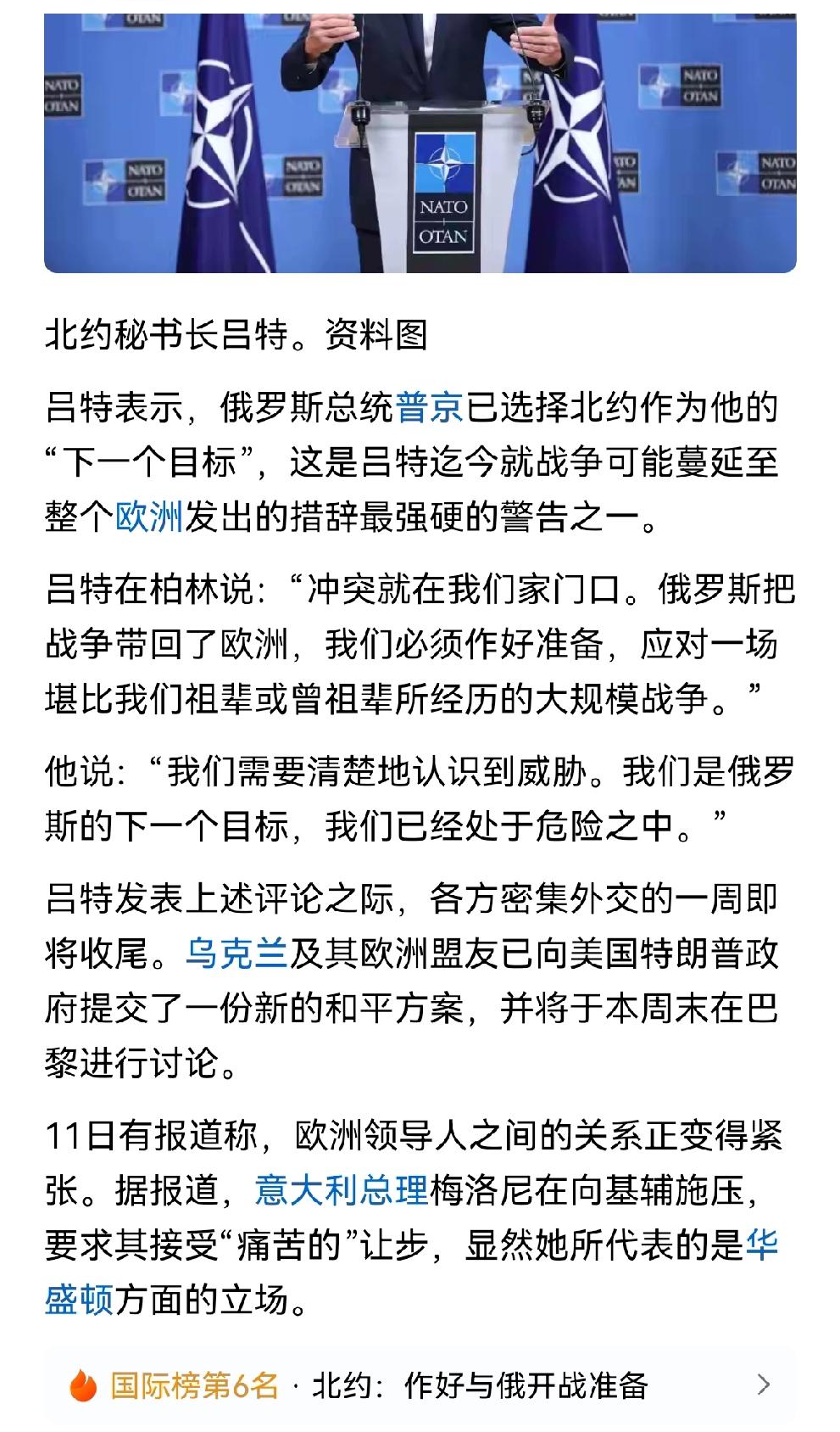 欧洲人为什么如此好战? 因为北约有人绝不允许欧洲和平发展。 什么叫“准备一场与大鹅,规模比祖辈经历还要宏大的战争”? 这位北约秘书长不遗余力的贩卖欧洲焦虑,犹如一个战争犯子。 他抓住了欧洲各国是靠殖民抢夺世界各地资源崛起的历史,长期存在地域分歧与权利争夺造成对当前安全格局担心焦虑的心理。 欧洲越乱,他们地位越稳。 有这群人,欧洲太平不了。