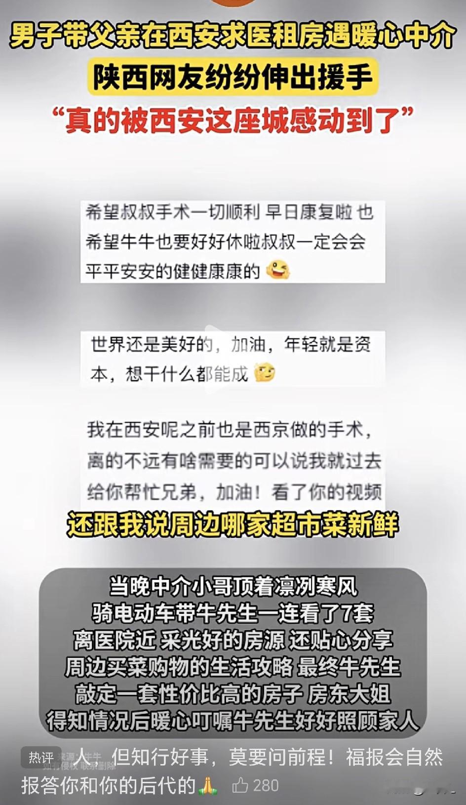 房东妈妈嫌病人“不吉利”?中介小哥怒怼:这房我们不租了! 西安这两天温度直降,但有个山西汉子心里却热乎乎的。 事情是这样的:12月5日,山西的牛先生带着父亲来西安看病,想租个房子落脚,租房前也和房东讲明了是来看病的。 没想到,去看第一个房子时,却被房东妈妈拦在了楼下:“不行不行,这不吉利!” 话刚落地,旁边陪看房的中介小哥立刻搭上牛先生的肩膀:“哥,咱走!这房我们不租了!”回头又补了一句:“谁家还没个生病的时候?” 这话说得,硬气! 当天晚上,寒风刮得人脸生疼。中介小哥骑着电动车,载着牛先生在医院周边转悠,一连看了7套房子,专门找那些离医院近、阳光又好的。 一路上,小哥嘴也没闲着:“这小区门口菜新鲜”“那边超市晚上八点后半价”…… 最终牛先生租下了一所性价比很高的房子,房东大姐知道了情况,非但没嫌弃,还暖心叮嘱牛先生好好照顾家人! 后来牛先生才知道,这个小哥的父亲也在和癌症抗争。原来,那份贴心,是从自己经历里长出来的温暖。 视频传到网上后,陕西老乡们坐不住了: 🌹网约车司机群里直接喊话:“需要接送说话,免费!” 🌹本地网友连夜整理攻略:哪个专家靠谱、哪片租房实惠、哪家肉夹馍正宗。 🌹还有人私信提醒:“兄弟,照顾好老爷子,你也得吃饭睡觉啊!” 牛先生本来被西安的寒风吹得心凉,这下直接被暖到眼眶发热:“西安的冬天是真冷,但这城里的人,也是真暖。” 网友热评: “房东怕‘不吉利’,却不知道善良才是最好的风水!” “陕西人:我们的暖,是雪中送炭的暖!” “建议房东挂个牌:只租给永远不生病的超人。” 一次仗义的转身,一句朴素的共情,一次默默的陪伴,一场自发的接力——这些微小的光芒,最终汇聚成了足以驱散城市严寒的人间暖阳。 最宝贵的“吉利”,是植根于人心深处的良善。 愿我们都能成为那个在他人需要时,敢于说“这房我们不租了”的人,更愿我们生活的每座城,都因无数普通人的微光,而变得真实可亲、暖意融融。 你在陌生城市遇到过哪些暖心瞬间?评论区聊聊,点赞分享,让温暖传递下去! 信息来源于文明西安,侵联删!