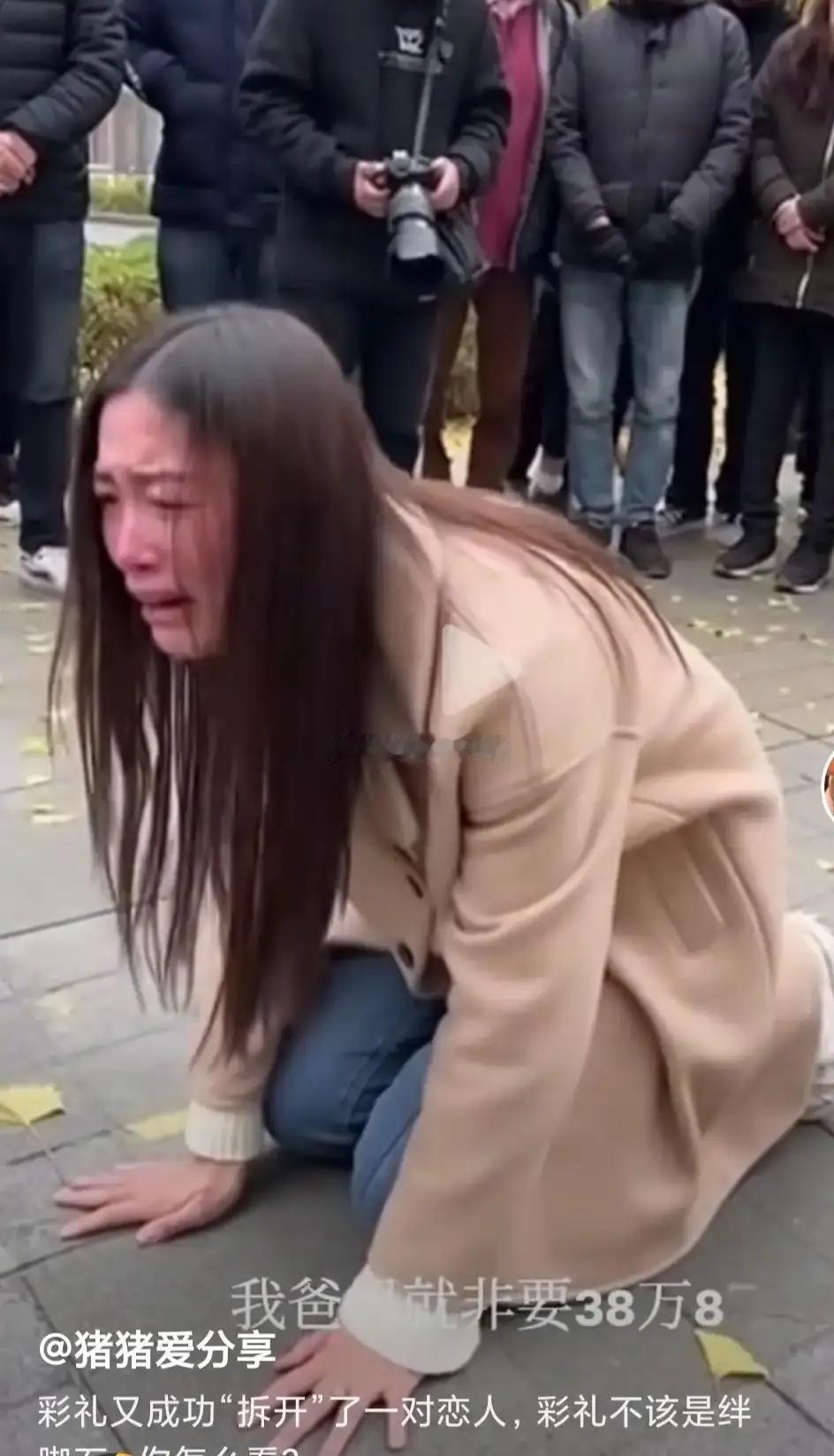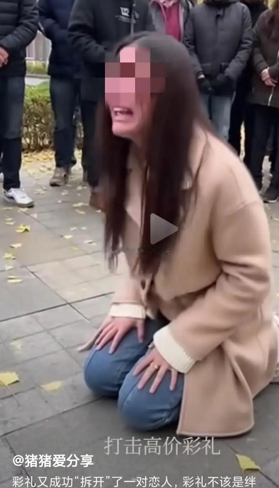 “打击高价彩礼,让彩礼回归于礼”。 然而,站在这个纷纷扰扰的社会现象背后,我们是否真正看到了那个女孩的心声?她的哭诉不仅仅是对彩礼数字的抗议,更是对整个婚姻价值观的深刻质问。她在街头跪地,泪水模糊了视线,却清晰地映照出一代年轻人对传统习俗的困惑与无奈。 38万8的彩礼,究竟是爱与责任的象征,还是一道难以逾越的高墙?很多普通家庭的父母,出于对女儿未来的期望和尊重传统,可能会觉得“彩礼象征着男方的诚意和家庭的认可”。但现实却告诉我们,这样的“象征”逐渐变成了经济的负担,变成了婚姻的门槛。 试想,一个普通的家庭,辛辛苦苦攒几年,可能也难以拿出如此巨额的彩礼。甚至有人要变卖房产、借高利贷,只为迎合所谓的“门面”。这样的压力,谁能承受得住?而这背后隐藏的,是社会普遍的价值扭曲——金钱决定幸福,彩礼成了“条件”。 更令人心碎的是,许多美好的爱情被高价彩礼折磨得支离破碎。那些曾经的甜蜜时光,逐渐被“钱”的阴影笼罩。情侣们的梦想变成了“能不能凑够彩礼”的焦虑,爱情变成了“买卖”。 有人说,真爱无关数字,那是对的。但真爱需要一个公平、尊重的环境。现在的彩礼,变成了“交易”,让很多年轻人望而却步。那份原本纯粹的爱情,被物质的重压压得喘不过气。更有甚者,彩礼成为了家庭之间的“攀比”,让婚姻变成了一场“看谁出得多”的比赛。 面对这样的现实,不少人呼吁“打击高价彩礼,让彩礼回归于礼”。这不仅仅是为了减轻年轻人的负担,更是为了重塑婚姻中应有的尊重与平等。婚姻不应成为金钱的交易场,而应是两个人携手共度未来的承诺。 女孩的哭诉,唤醒了我们对传统的反思。我们是否应该停下脚步,重新审视那份“礼”,而不是用数字堆砌的“礼”。让婚姻回归本质,让爱不再被金钱绑架。 或许,改变从我们每一个人开始。我们该用行动,去呼吁公平与尊重,让婚姻不再成为“高价交易”的代名词,而是真正的情感归宿。只有如此,未来的爱情,才能真正纯粹而美好。