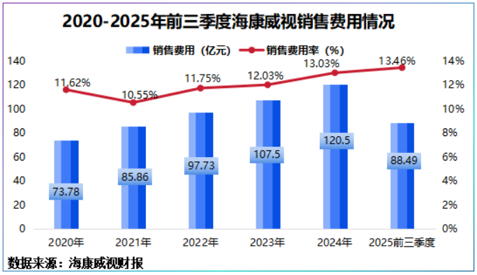 2020年海康威视销售费用为73.78亿元,销售费用率为11.62%,但到了2024年其销售费用高达120.5亿元,销售费用率提高到了13.03%,算上2025年前三季度累计投入约574亿元。