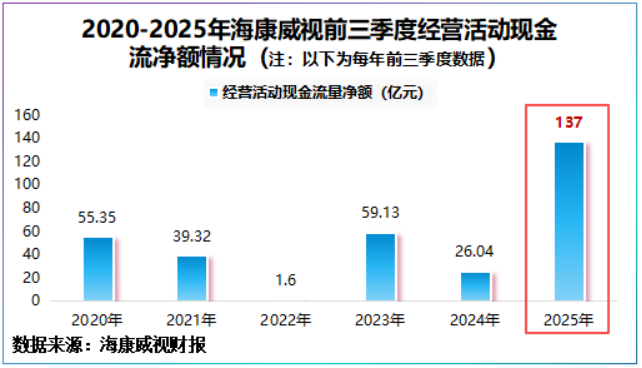 前三季度,海康威视实现净利润93.19亿元,同比跃升15%,经营活动现金流量净额同比劲增426.1%,达到137亿元,是净利润的1.47倍,盈利与成长双重狂欢。
