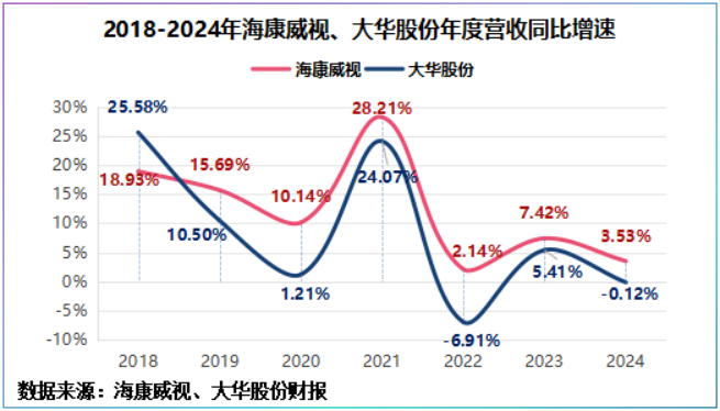 不过,并非海康威视一家承压。在同一周期内,大华股份的营收增速也从2021年的24.07%快速回落至2023年的5.41%。