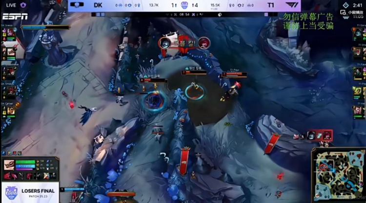 [15:00]DK强行拿下先锋,但是Oner蔚强锁配合队友瞬间秒掉了ShowMaker蛇女!DK团战直接炸了啊!T1追击越塔各个击破,最终团灭DK!这波打完经济差都6K多了!T1随后再拿小龙!听牌了!不过随后Faker阿卡丽和Doran约里克都白给了,Doran更是送给了Smash霞1030的赏金!