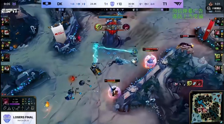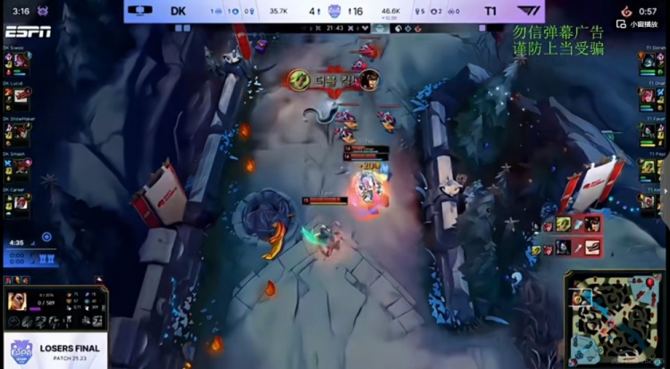 [21:24]Doran约里克下路带掉高地,DK想打厄塔汗!Keria洛强开用自己的命换掉了厄塔汗!残局Oner蔚锁头留住Smash霞将他秒了!DK团战根本打不过啊!T1击杀DK四人,再破中路高地!
