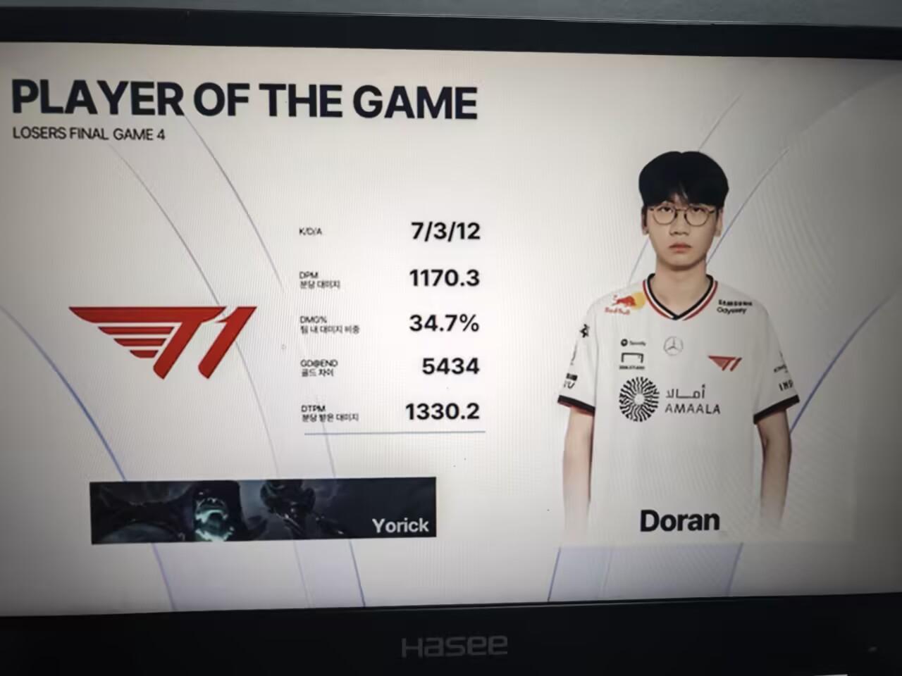 虎扑12月13日讯在刚刚结束的Kespa杯败者组决赛的比赛中,Doran掘墓砍下7/3/12的战绩,拿下T1对阵DK第四局MVP