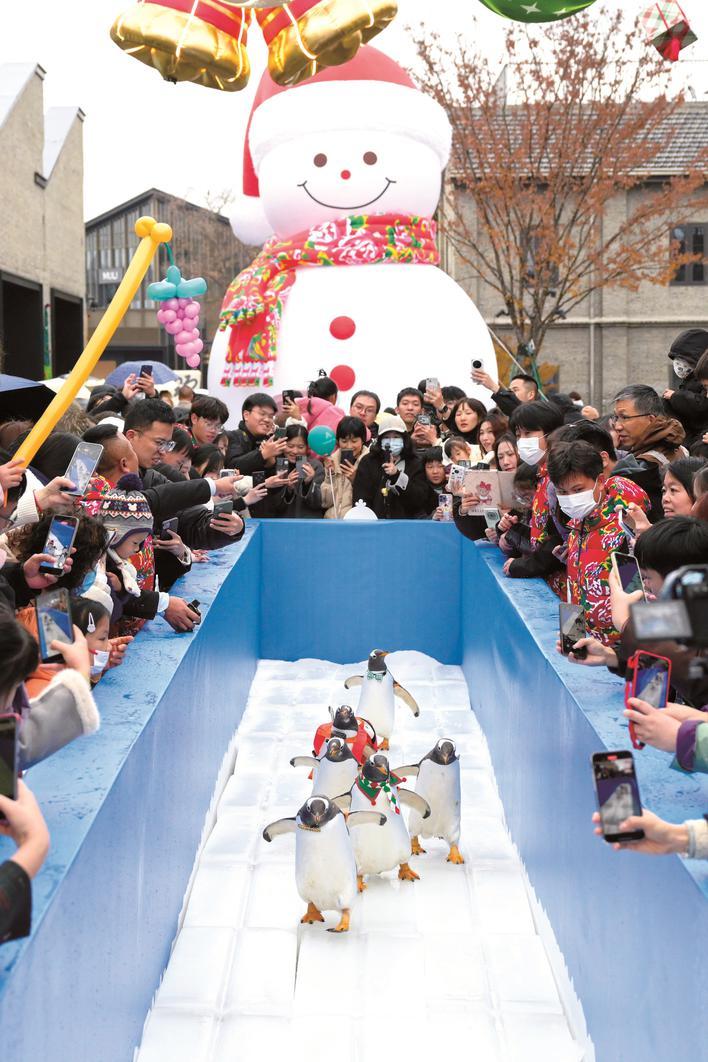 昨天下午,嘉兴市区南湖天地迎来了一场别开生面的企鹅巡游活动,数只憨态可掬的企鹅沿着特制的冰雪通道缓步前行,圆滚滚的身形搭配可爱的装扮瞬间成为全场焦点,市民和游客纷纷举起手机、相机记录这一趣味时刻。■摄影记者俞中岳
