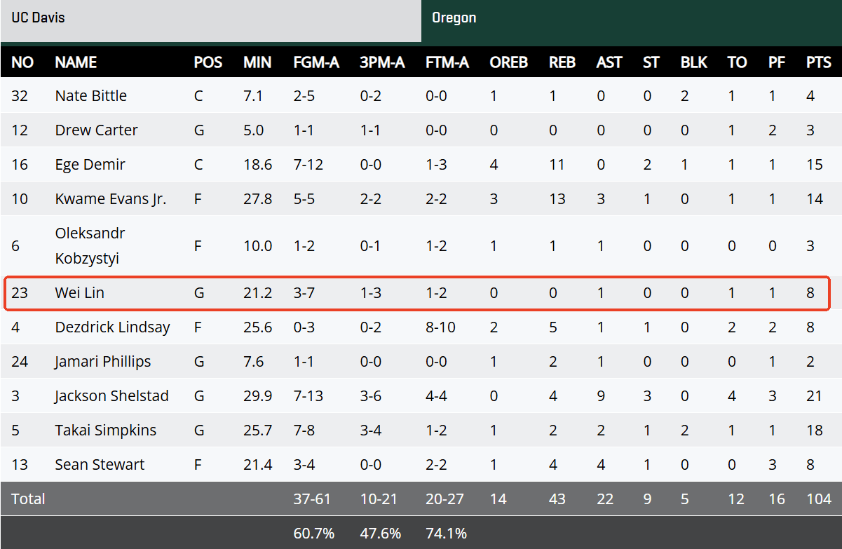 NCAA常规赛:林葳8分,俄勒冈大学大胜加州大学戴维斯分校