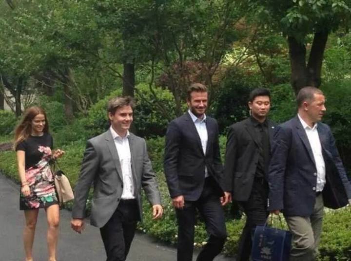 照片里,贝克汉姆和四位当年给他烧菜的厨师合影,傅明亮只有半张脸入框,有点遗憾。