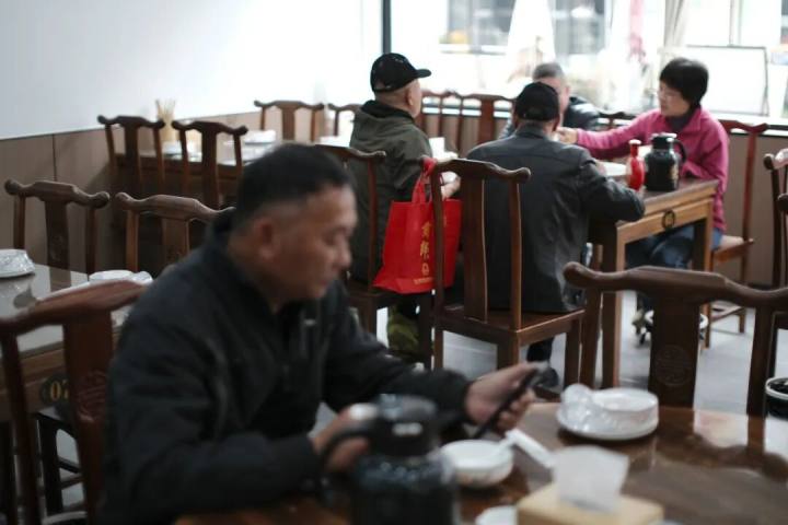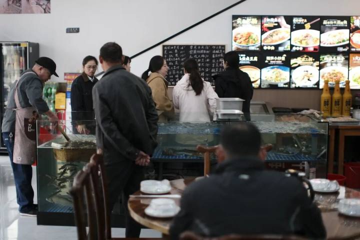 傅明亮的码头饭店就开在老街中间,八点就开门,附近镇上街坊来吃碗片儿川。接着是午市晚市,九点半打烊,也看客人情况,有时候老酒吃晚一点,就晚点关门。