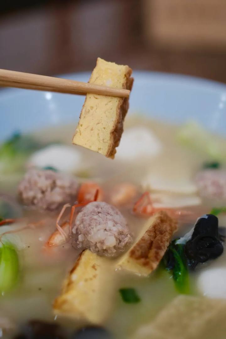 傅明亮叫我尝尝农家三鲜,萧山人红白喜事都要上的一道菜,鱼圆、肉圆、蛋糕都是当天新鲜做的。