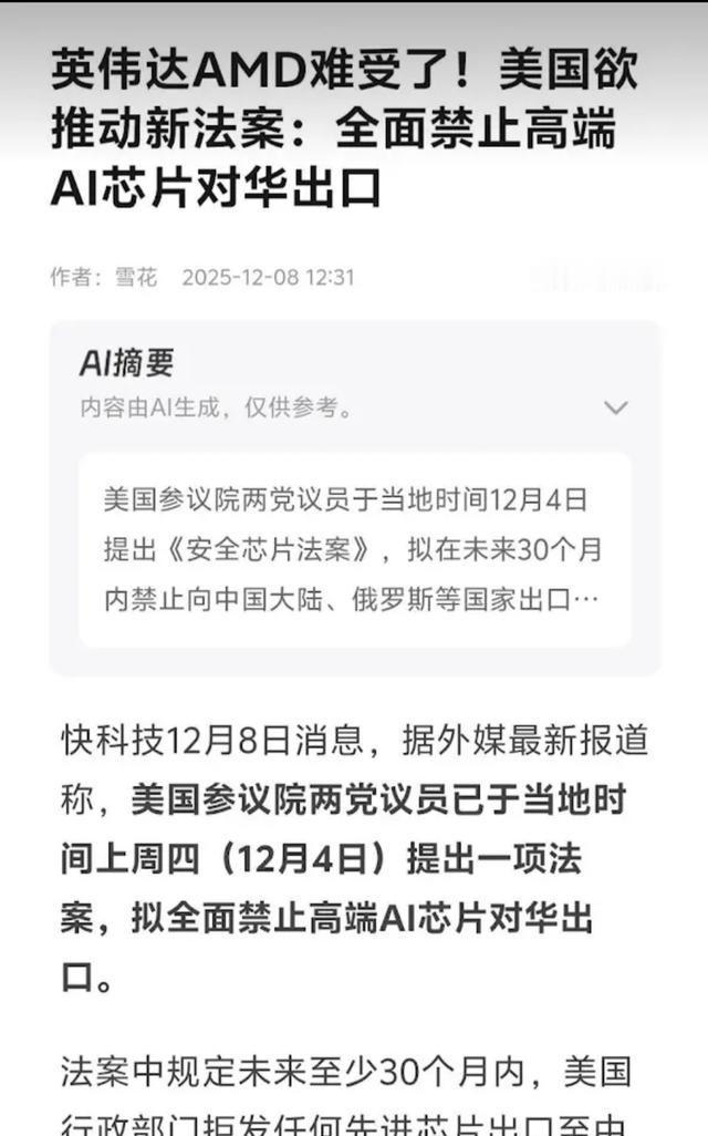 差点要被黄仁勋笑死,刚说好英伟达可以卖H200给中国,中国还没表态要不要,大美丽两党议员联手提出了新的《芯片安全法案》,规定未来2年半的时间里,禁止任何高端AI芯片出口至中俄伊等国。老黄算是空高兴一场! 英伟达作为全球领先的芯片企业,黄仁勋领导下不断创新。H200是第二代高性能AI处理器,计算能力强,用于大型模型训练。但美国出口管制长期限制其进入中国市场。2025年12月8日,特朗普宣布批准出口,条件是芯片售给经审核客户,并将部分营收上缴政府。这项决定源于美中贸易平衡考虑,特朗普在社交媒体上公开声明,强调维护美国利益。英伟达股价随之上涨,市场反应积极。黄仁勋此前与特朗普会面,讨论出口政策,支持美国公司保持领先。 中国市场对英伟达重要,占其营收显著份额。特朗普批准后,北京尚未正式回应采购意向。专家分析,中国可能评估芯片性能和本土替代选项。H200虽先进,但中国已推动国产芯片发展,如华为海思产品。特朗普决定逆转前任管制姿态,旨在刺激经济,但引发国会不满。议员担心技术外流影响国家安全。黄仁勋公开表示,公司遵守所有法规,继续推动全球销售。 就在特朗普批准几天前,2025年12月4日,美国国会两党议员推出《芯片安全法案》,也称SAFE CHIPS Act。提案者包括民主党参议员马克·华纳、共和党参议员马可·鲁比奥和汤姆·科顿。他们联合要求商务部在未来30个月内拒绝高端AI芯片出口许可,针对中国、俄罗斯、伊朗和朝鲜。法案锁定当前管制水平,防止行政部门放松。华纳强调,美国需保持AI领先,限制对手发展。鲁比奥指出,芯片出口可能助长竞争对手军事能力。 这项法案直接针对特朗普的出口放宽,议员们协调支持,收集签名。文本列出禁止芯片类型,包括英伟达H200。提出后,法案进入审议阶段,需要委员会辩论和投票。商务部官员将提供证词,评估影响。专家认为,这反映国会对行政权力的制衡,两党在国家安全议题上罕见一致。英伟达回应称,将观察政策变化,调整策略。黄仁勋指示团队准备合规措施。 法案背景源于美中科技竞争加剧。美国自2022年CHIPS Act以来,投资本土半导体生产,减少依赖。出口管制旨在拖慢中国AI进步,尽管技术封锁难完全实现。中国加大研发投入,推动国产替代,如发展光刻机和先进节点芯片。俄罗斯和伊朗也受管制影响,寻求绕道获取技术。议员们认为,30个月冻结期能给美国时间巩固优势。特朗普政府辩称,出口能带来营收,用于国防。 黄仁勋作为英伟达领导者,面对政策波动需灵活应对。他多次公开谈及出口管制,强调美国公司需全球市场参与。2025年早些时候,他警告管制可能适得其反,推动对手加速自研。英伟达已开发中国专用版本芯片,如H20,性能降低以合规。H200批准一度提振信心,但新法案带来不确定性。市场分析师预测,若法案通过,英伟达中国营收将受冲击,转向其他地区。