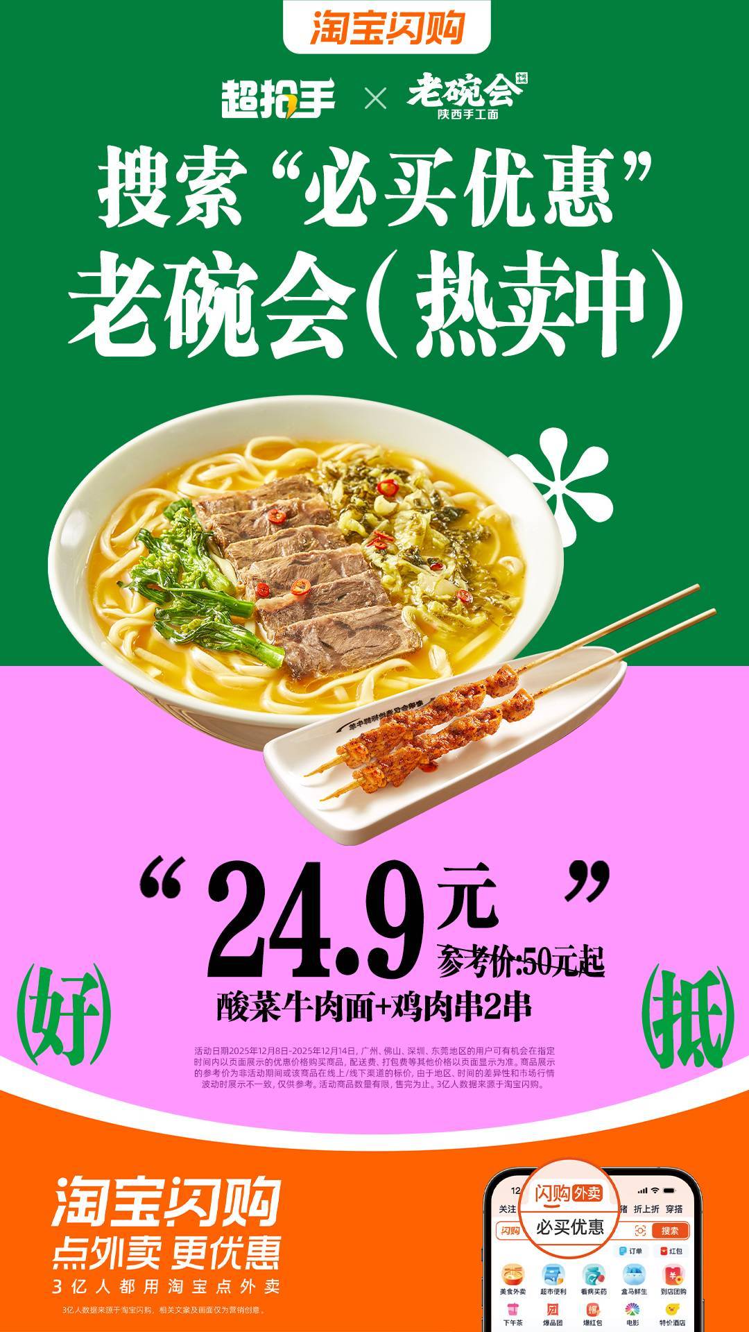 淘宝闪购老碗会陕味经典一碗到位周日临时要赶方案,点个外卖陪自己加班。淘宝闪购超抢手上老碗会的这个24.9元起的套餐-【酸菜牛肉面+鸡肉串2串】,真的太懂打工人的胃了!付款时惊喜发现,这价格刚好能参加淘宝闪购的满25送奶茶免单券活动!上淘宝闪购搜【必买优惠】,大牌19.9元起,满25元就送奶茶免单券,加班都有动力了。淘宝闪购超级周末必买优惠淘宝闪购必买清单