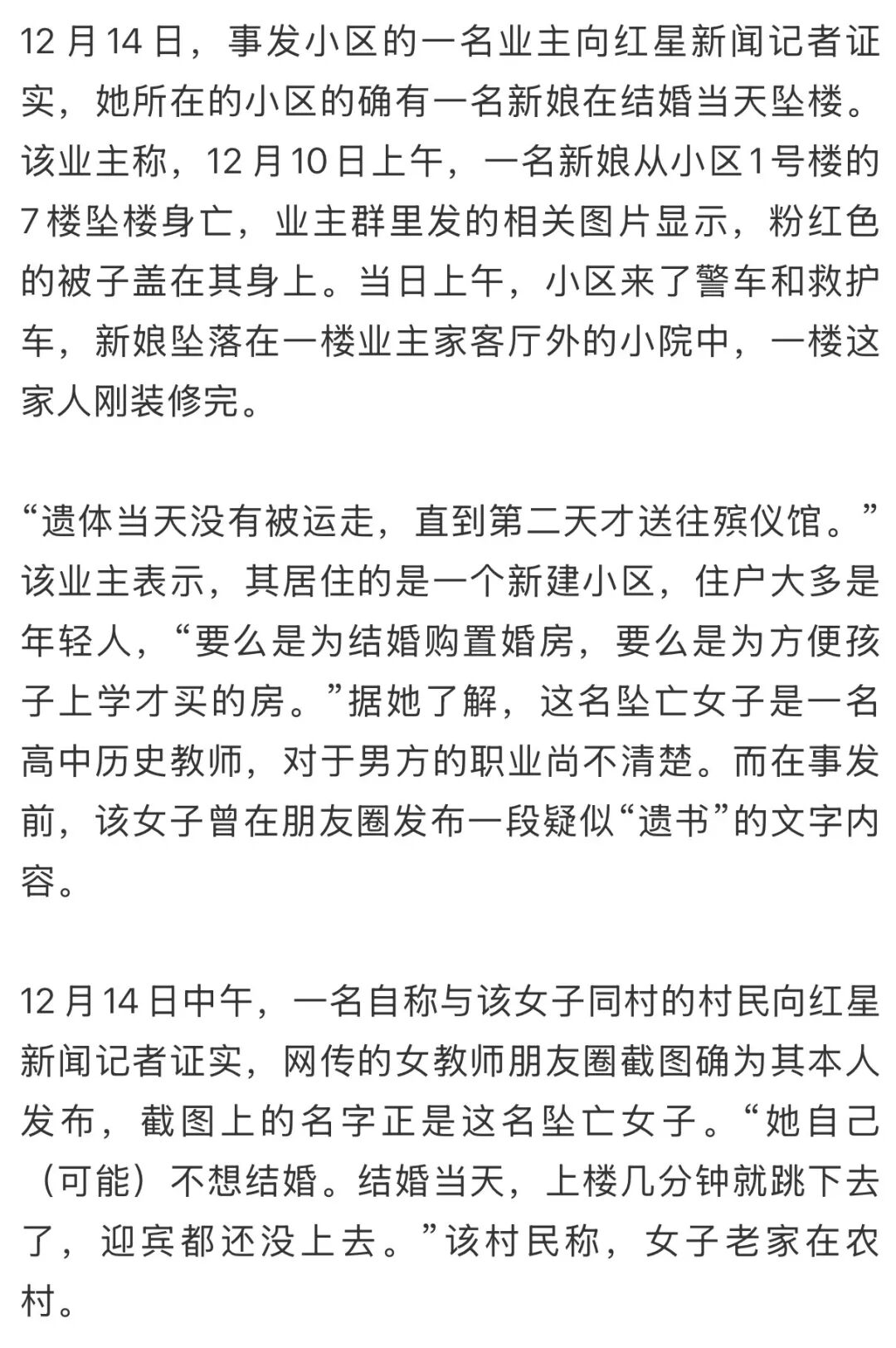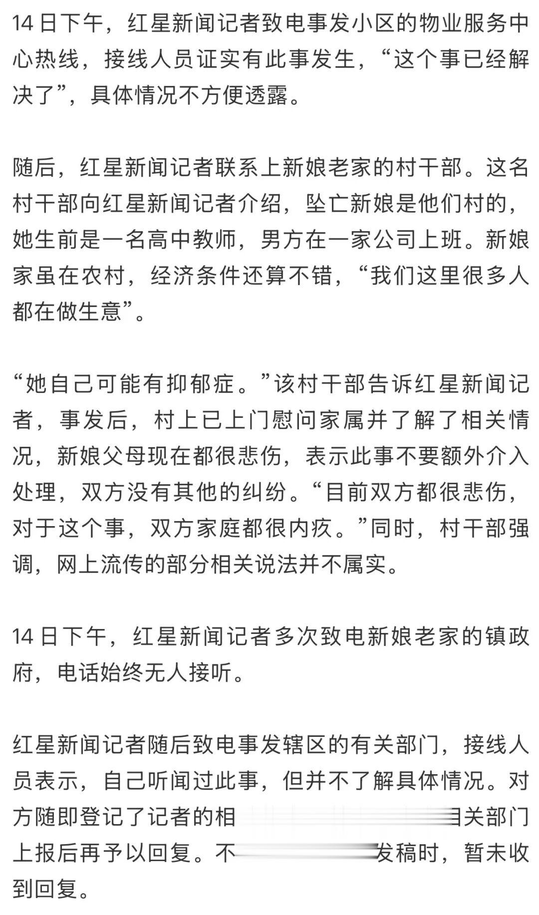 12月14日,事发小区的业主及新娘老家的村民向红星新闻记者证实,这名女教师在结婚当天从7楼坠楼身亡。其老家的村干部告诉红星新闻记者,事发后,村上已上门慰问家属并了解了相关情况,“她可能有抑郁症。”目前,双方家庭都很悲伤和内疚,双方没有其他纠纷,表示不需要额外介入处理。