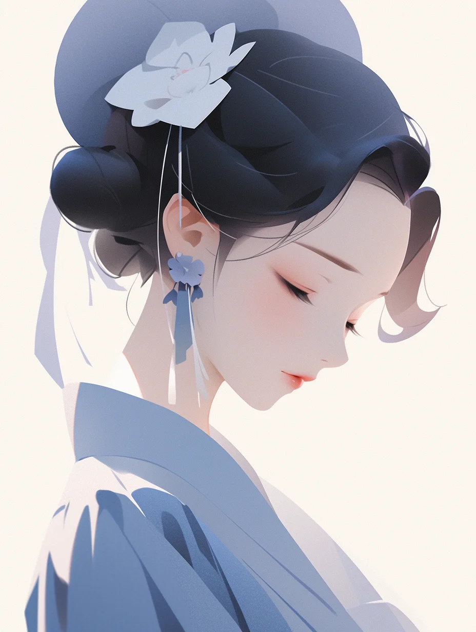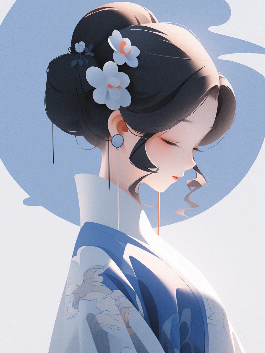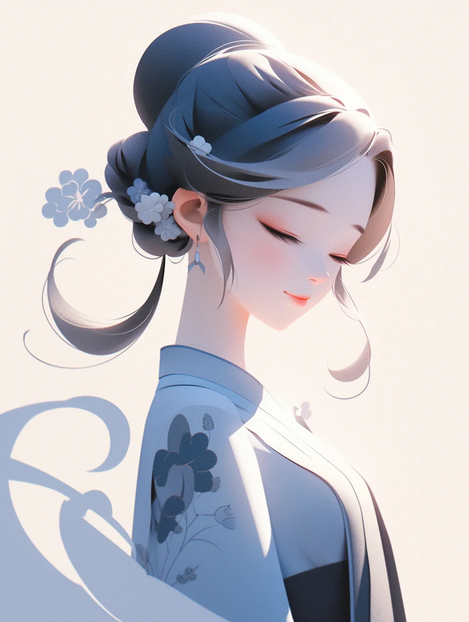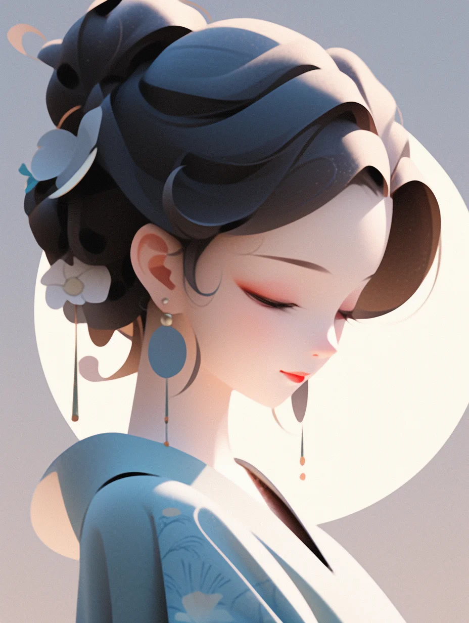咒语:Realistic 3d cartoon style rendering, Portrait, a cut girl, Chineseicist character illustration, Song dynasty style, minimalism, geometric shapes, melancholic blue clothing, Qiu Ying style --ar 3:4 --s 400 --no triangle