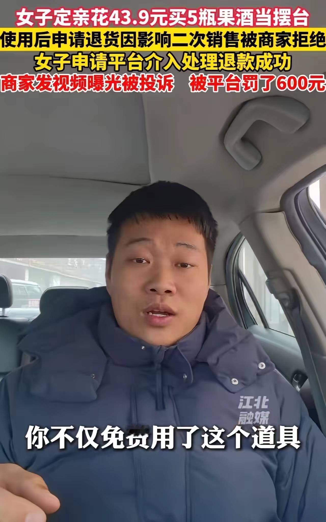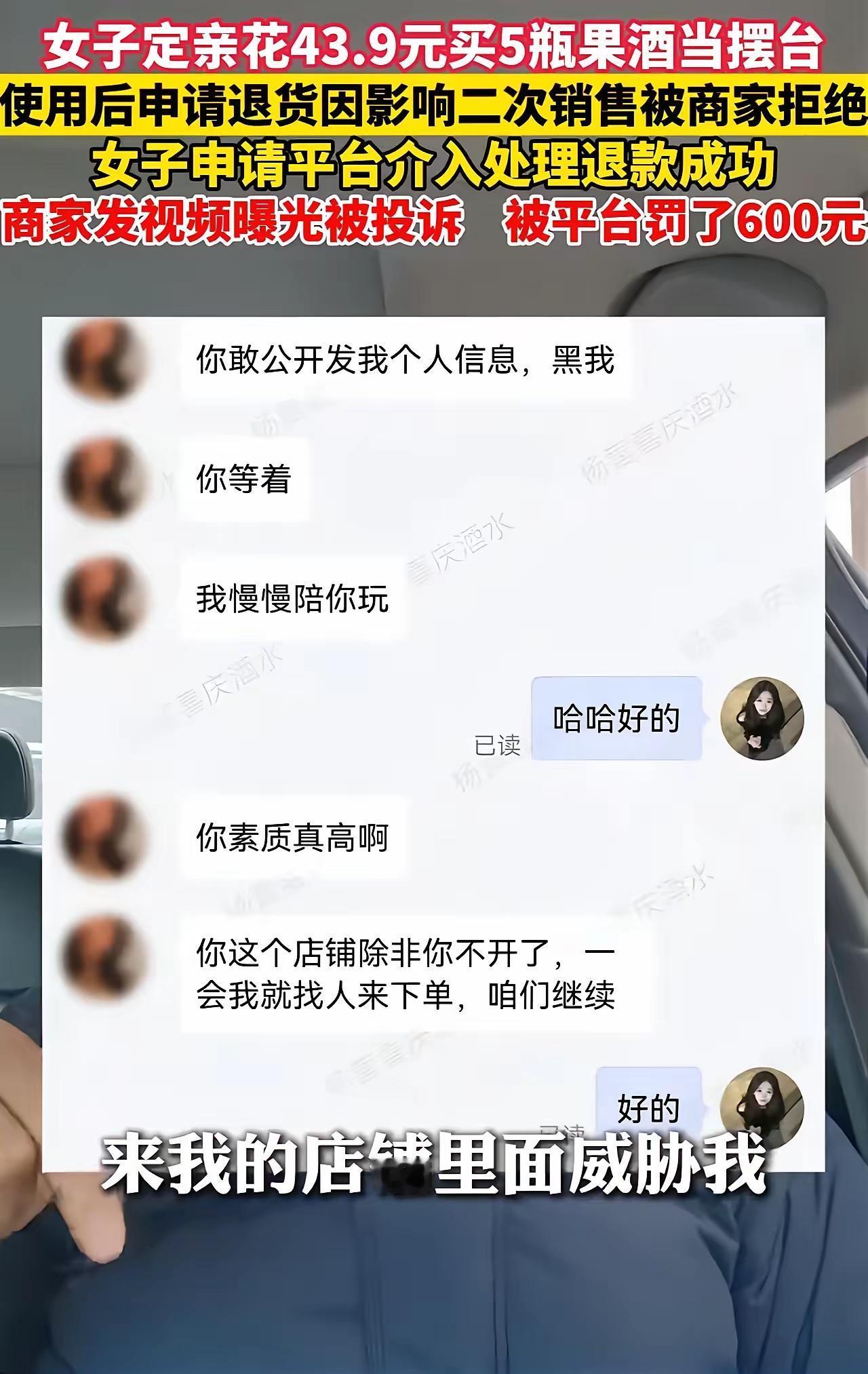 潍坊这女的操作,真给我开眼了! 婚礼买5瓶果酒才花43.9元,摆完台包装扔了、喜字也贴了,转头就申请退货,还说有质量问题让商家倒贴运费! 商家肯定不同意啊,这都没法二次销售了!结果平台居然给她退了款,还罚商家600块,等于她白用酒还赚了钱!商家发视频吐槽,她不光不害臊,还威胁要恶意下单、骂人,商家回骂两句又被平台罚,还好后来平台调查退了商家罚款。 说真的,结个婚几十块的东西都要白嫖,还得从商家兜里捞钱,这也太没皮没脸了!真不知道嫁到哪家,男方家是“祖上积了大德了”,能摊上这么“会过日子”的媳妇! 消费哪能这么没规则?这样的行为不管管,商家还怎么安心做生意?消费底线到底该谁来守? 潍坊女子婚礼用酒白嫖事件 消费不能没底线 网购奇葩事