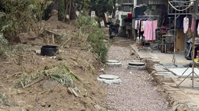 粗略来看,该小区几乎一半以上的路面都被挖开,居民楼前的道路只留下两条供人通行的窄路,路中间有凸起的井盖和未干的水泥,小区多处路面铺设有钢板或木板遮盖坑洞,但由于衔接不平,且木板边缘断裂,稍不留神就容易踩进塌陷区域。记者到达的时间正值附近小学放学,不少家长接孩子回家,一手挂着书包,一手扶着孩子,艰难地在夹缝中穿行。车辆通行则更为困难,由于多条车道都在施工中,可供车辆通行的路一旦会车就会彻底堵死。
