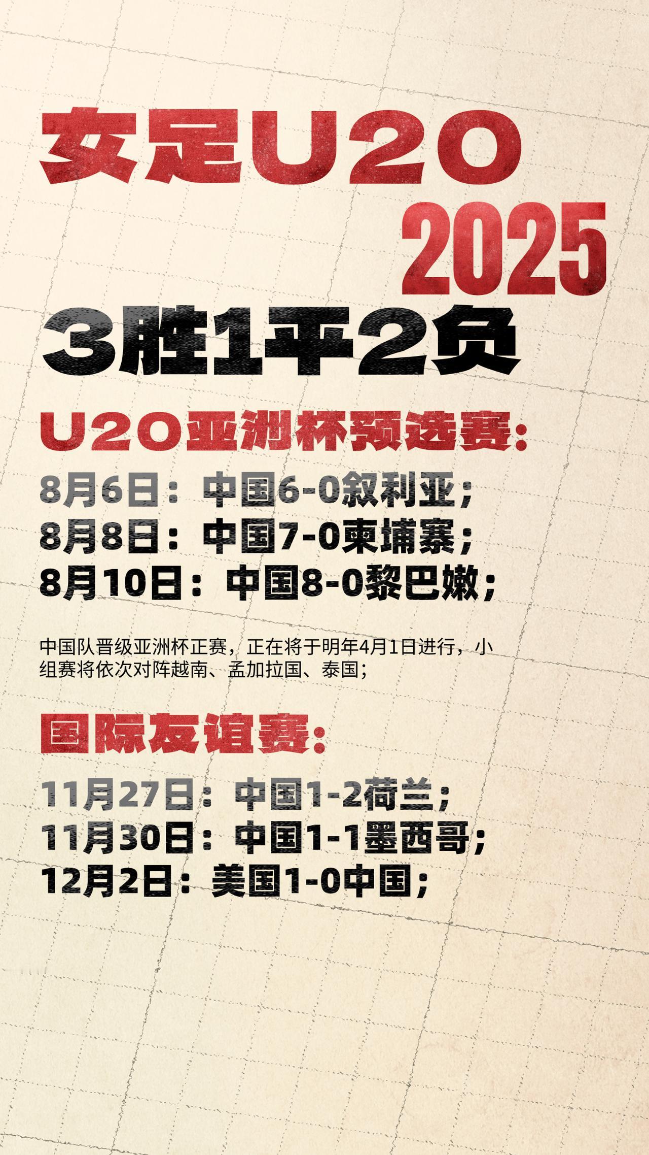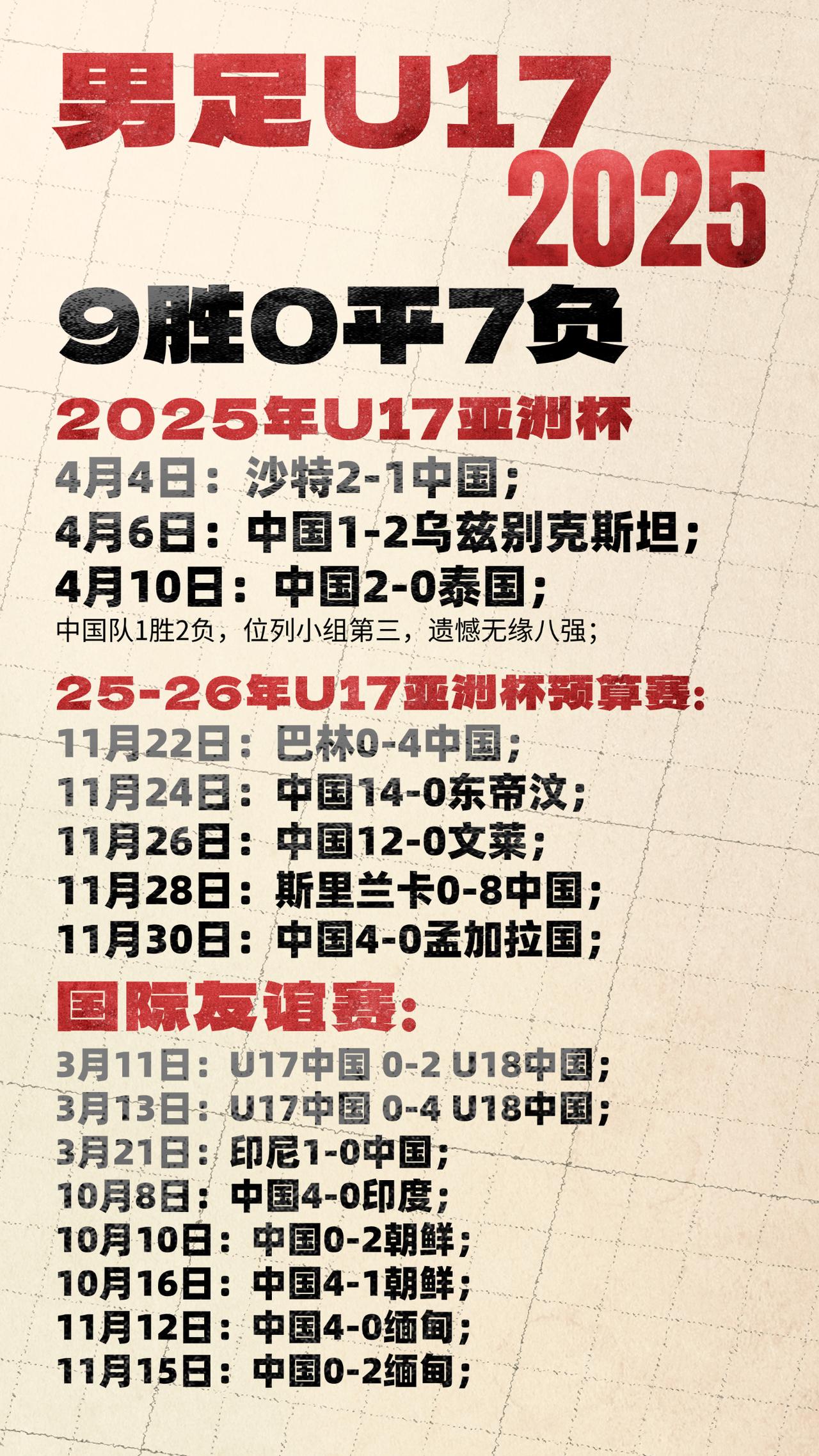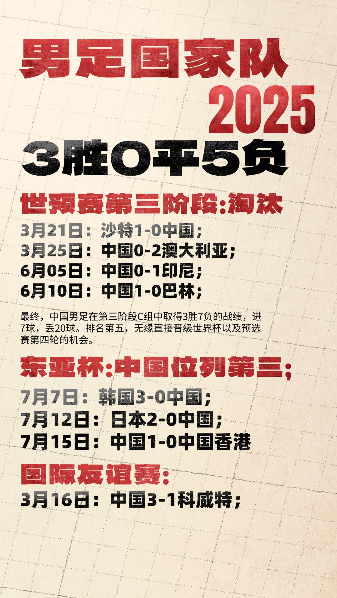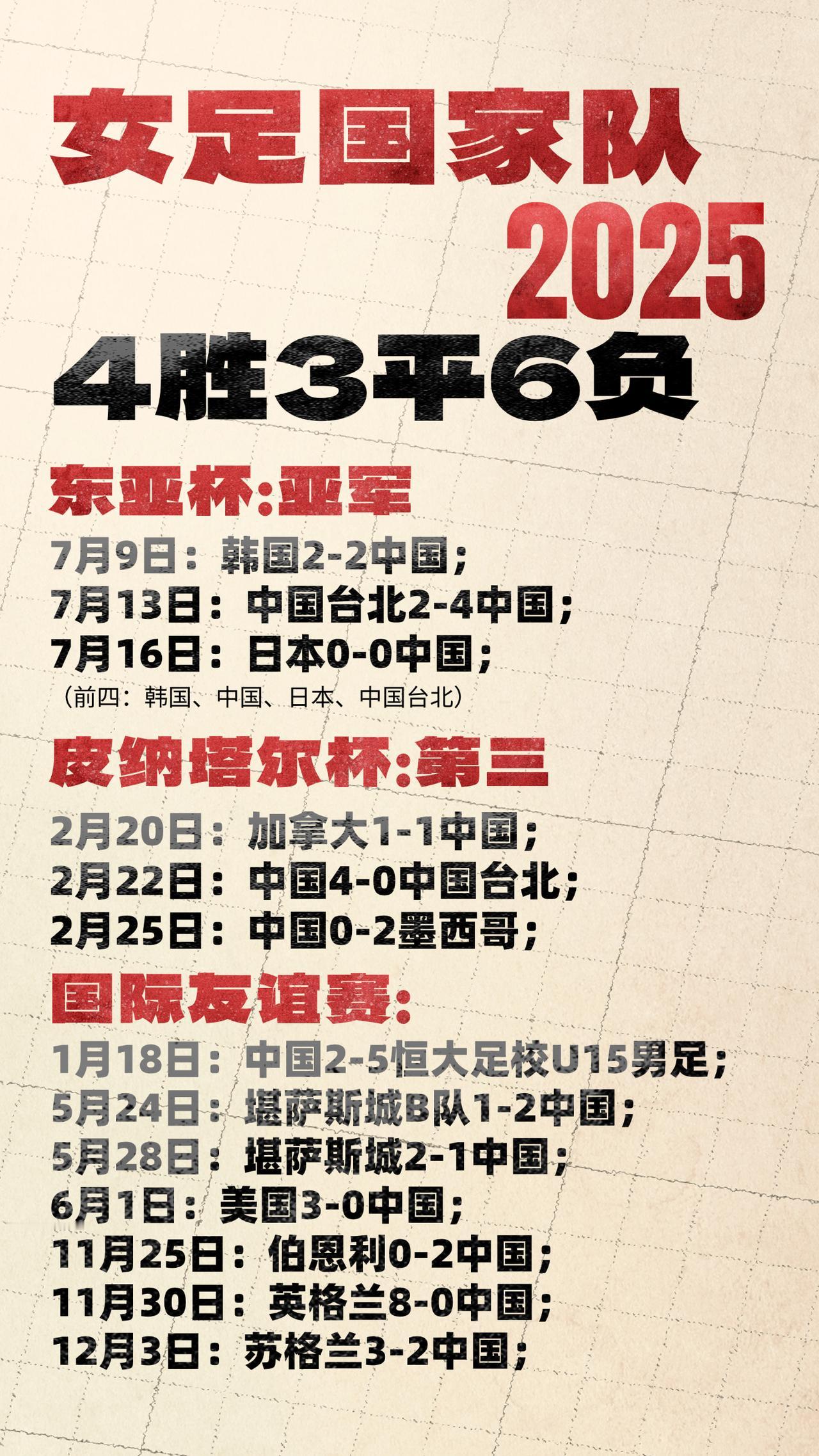 中国体育2025年总结(1)足球:成年队的寒冬与青训的微光中国足球2025中国体育盘点 2025年对中国足球而言是充满反差的一年。男子成年国家队在世界杯预选赛中表现低迷,3胜7负、进7球失20球的成绩直接导致提前无缘2026年世界杯,世界排名亦下滑至亚洲第14,延续了多年来的颓势,令广大球迷深感失望。 然而,男足青年梯队(U系列)的整体表现呈现出积极信号。多支年轻队伍在亚洲乃至国际青年赛事中展现出竞争力,例如U16男足夺得“兴泰杯”冠军、U22男足在“盐城赛”力压韩越夺冠、U17亚洲杯预选赛5场全部狂胜。虽然成绩仍有起伏,但年轻球员在对抗亚洲同级对手时已能取得一定优势,显示出青训体系可能正在孕育转机。 相比之下,女足的整体趋势令人担忧。成年女足世界排名下滑至第17位,亚洲第4的位置亦受到挑战;对阵欧美强队时劣势明显,最近一次友谊赛中以0-8惨败英格兰,再次重现中国女足历史上的败绩最大分差。传统技术优势逐渐减弱。尽管U系列女足在部分赛事中仍有亮点(如U16女足获蒙太古杯亚军),但人才储备与欧洲迅速职业化的差距可能进一步拉大,即使面对亚洲弱旅也难以取得以往的比分优势,未来争夺亚洲霸主地位乃至世界竞争力的前景不容乐观。 总体而言,中国足球在2025年呈现“男足青年曙光初现,女足优势持续侵蚀”的格局。 若想实现长远振兴,男足需将青年层次的进步有效转化为成年国家队实力,而女足则亟需系统性升级,以应对全球女子足球快速发展带来的挑战。 2025年,中国男子各级国家队战绩:41胜13平25负;中国女子各级国家队战绩:19胜4平13负;