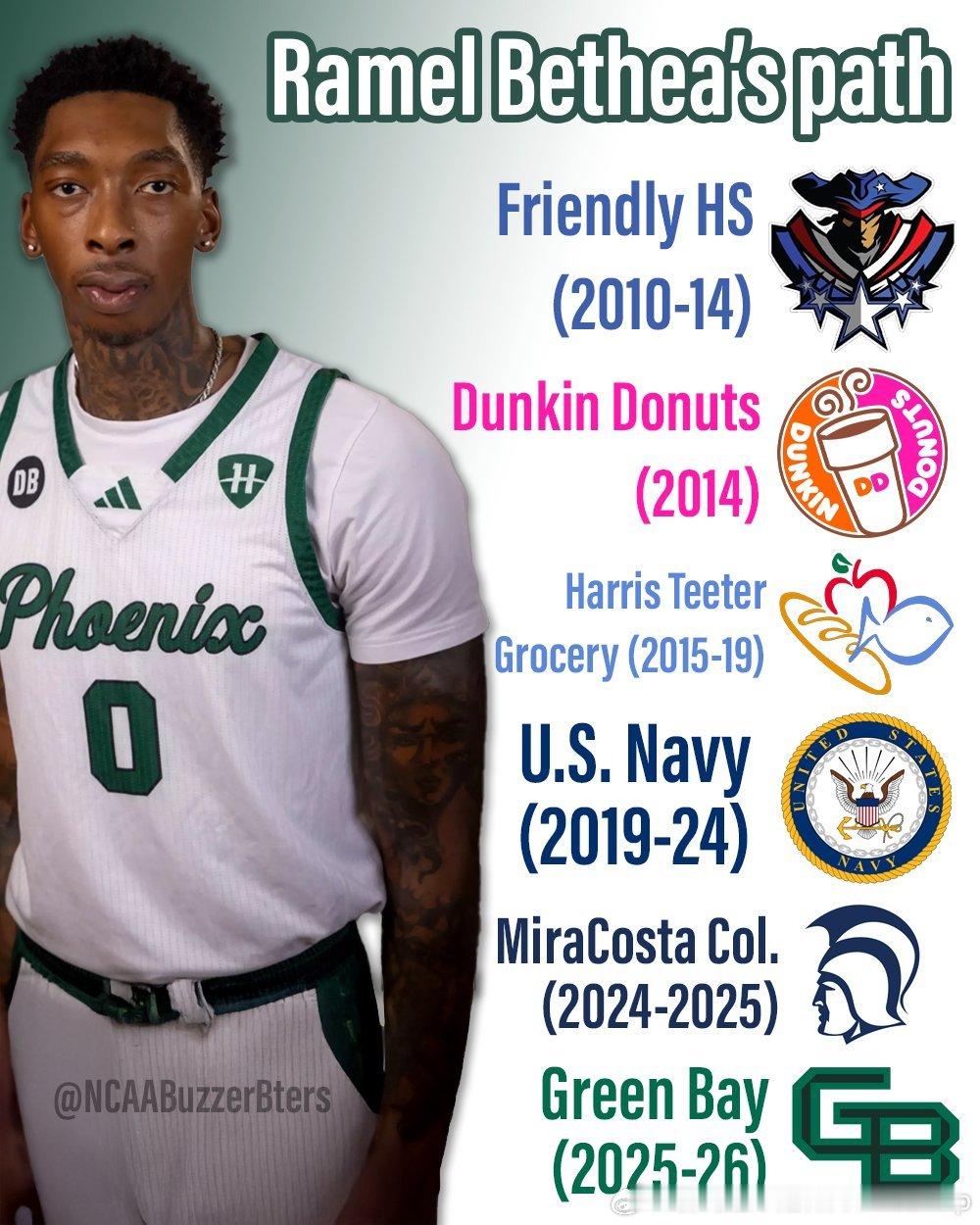 30岁的大二生你没听错,来自NCAA一级绿湾大学大二前锋Ramel Bethea出生于1996年,明年将年满30岁。他的故事相当传奇。高中毕业只有190公分,非常瘦,也没打过篮球,高中毕业后曾在超市和Dunkin' Donuts打过工,但因疫情原因失业,2019年开始加入海军服役,入伍后身高猛增,从190公分长到了如今的206公分,臂展达到了224公分,服役期间因为身高猛增在战友的鼓励下开始打篮球,2024年退役后决定继续读大学去了社区大学,由于在社区大学的出色表现收到了多所NCAA大学的关注,最终在本赛季加入了绿湾大学,作为大二生他还可以在NCAA打三年NCAA