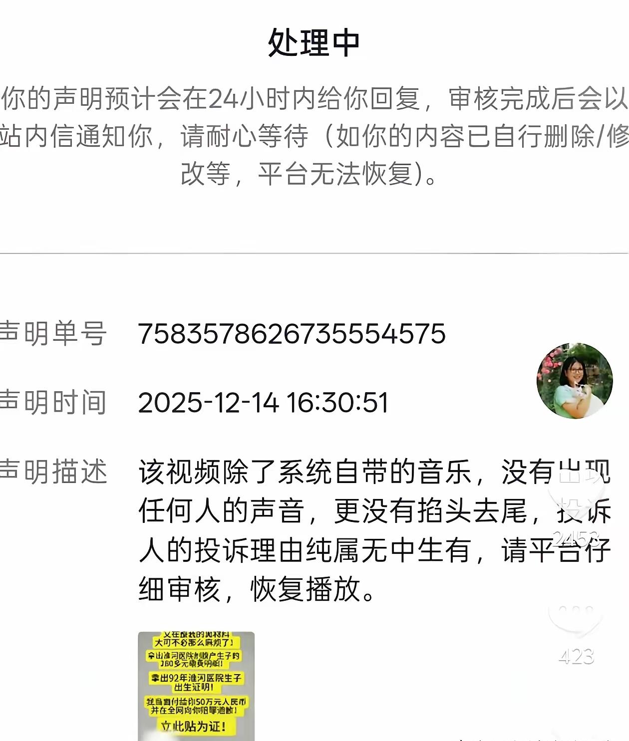 过去怀疑杜某枝是不是没有出生证明呀?现在东篱请她拿出来出生证明就给她50万,杜叉叉把这个作品投掉了,可以肯定她根本没有出生证明。 东篱清影今天早上浏览网页,征集杜叉叉出生证明的作品被“杜某某”投诉了,“视频禁止播放”了。我也经常被投掉视频,禁止播放就是原来的视频页面一片漆黑,就剩下视频禁止播放这六个字。 平台处理结果也被东篱截屏发出来,杜叉叉投诉理由是“此视频音频出现我声音,歪曲事实掐头去尾的遭遇我”,啥水平啊?逻辑都不通顺。 可是东篱清影这个视频,根本就没有杜叉叉的声音,甚至没有任何人的声音,也无所谓掐头去尾,平台就认同了,是不是也有熟人呀? 有网友说,杜叉叉不只是没有出生证明,也没有缴费单,就连病历都涉嫌伪造,没法证明她在淮河医院生过娃,别人娃咋到她家的? 这条评论下面,蹦出来一个另类,IP地址是山西的一个杜粉又在为杜叉叉招魂:她悬赏再多钱,也没资格要老杜拿这个单那个证。这种家伙是不是脑子不灵光呀?