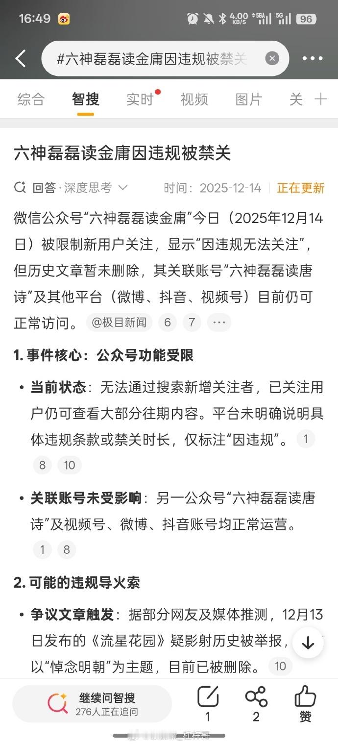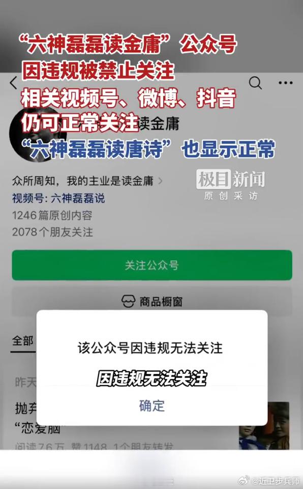 六神磊磊读金庸因违规被禁关这人是因为嘲讽大众对红楼梦悼明讽清的解读,于是阴阳怪气的发了篇流星花园悼明的解构文,本想以此讽刺大众“愚昧”,一股浓浓的文人酸味。这些现代文人的通病,还是在于脱离群众+不自知的清高+双标。他是解读金庸小说成名的,众所周知金庸小说本身就充满隐喻,尤其《笑傲江湖》,且金庸有些立场也挺脱离群众、脱离时代的。所以解读金庸的人,也非常喜欢阴阳怪气的拿小说情节,代入到他们的时事立场。他们可以借金庸小说夹带私货,却又反对老百姓借红楼梦来表达人民的观点,这种文人被抛弃也是迟早的事。六神磊磊读金庸公众号被禁关六神磊磊读金庸其他账号正常