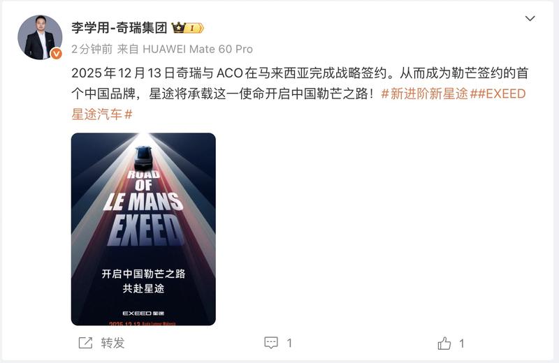 易车讯12月15日,奇瑞汽车执行副总裁李学用在社交媒体上宣布,12月13日奇瑞与ACO在马来西亚完成战略签约。从而成为勒芒签约的首个中国品牌,星途将承载这一使命开启中国勒芒之路。