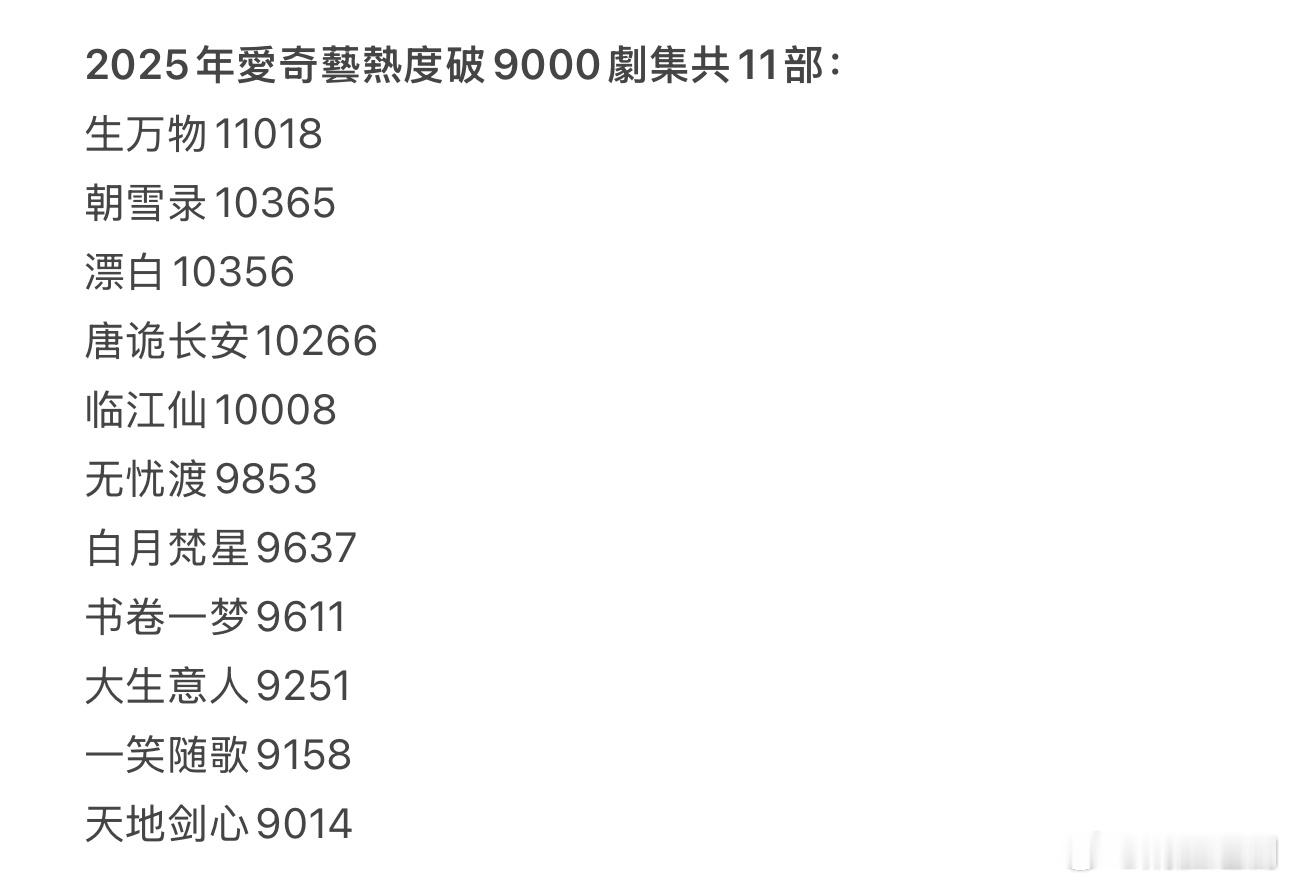 爱奇艺的剧站内热度破9000也是一道坎,每年将近200部剧能上9000的也是凤毛菱角。2025年破9000剧集共11部2024年破9000剧集共10部
