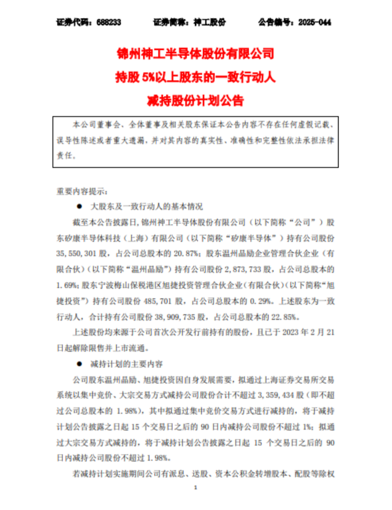 12月15日,神工股份(688233.SH)公布,公司股东温州晶励、旭捷投资因自身发展需要,拟通过上海证券交易所交易系统以集中竞价、大宗交易方式减持公司股份合计不超过335.94万股(即不超过公司总股本的1.98%),其中拟通过集中竞价交易方式进行减持的,将于减持计划公告披露之日起15个交易日之后的90日内减持公司股份不超过1%;拟通过大宗交易方式减持的,将于减持计划公告披露之日起15个交易日之后的90日内减持公司股份不超过1.98%。