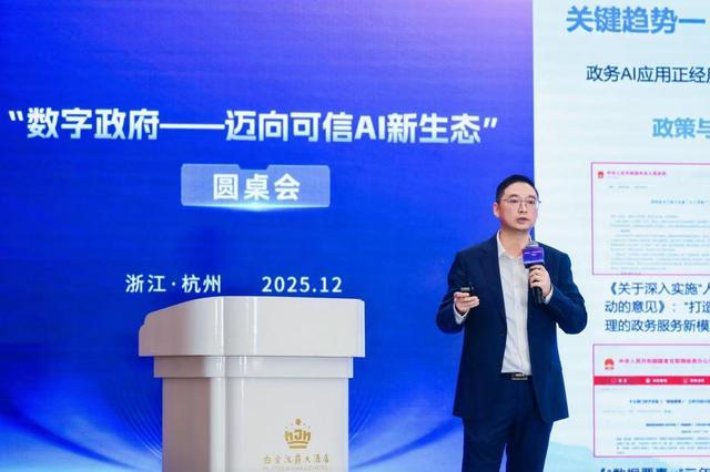 杭州市数据局党组成员、副局长齐同军介绍了杭州作为数据要素改革先行区,以《数据流通交易促进条例》为法治保障,从数据基础制度、基础设施、高水平开发及产业发展四方面系统推进。通过构建国家枢纽级数据空间、发放数据产权证书、运营公共数据场景及设立专项产业资金等实践,致力于打造“让天下没有难找的数据”的产业生态,为“AI+政务”提供可信、高效的数据支撑。