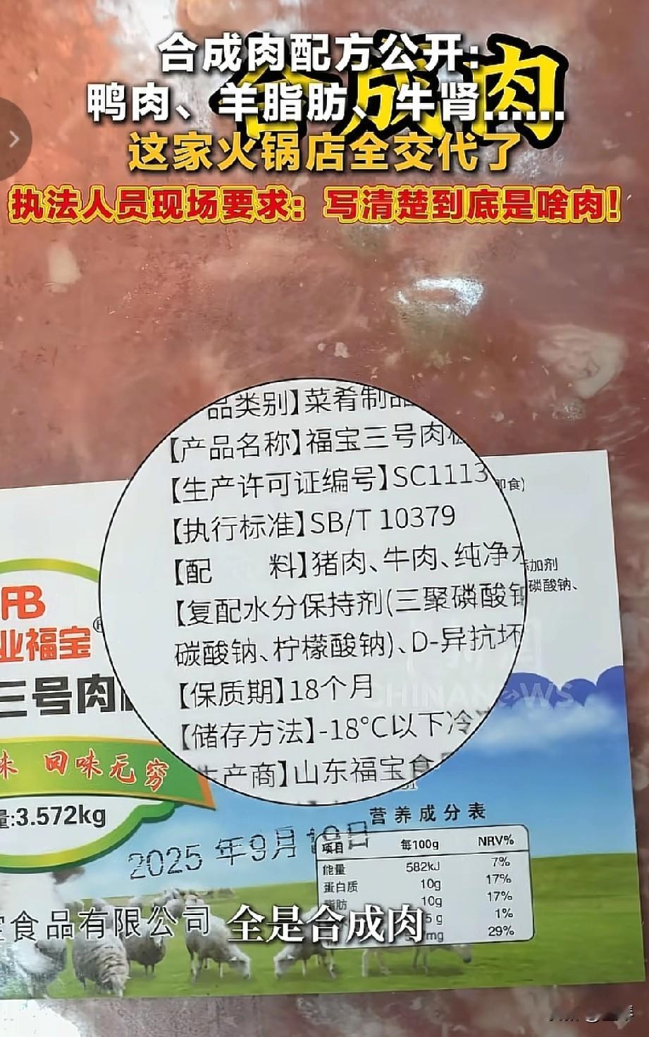 如果没有央视新闻曝光,你还要吃多少合成肉的火锅? 火锅店合成肉坑有多深?原料竟是鸭肉牛肾,别再被忽悠了! 咱去火锅店吃顿肉,本想大口炫纯牛羊肉,结果咬到嘴里的,竟是鸭胸肉、牛肾混着羊脂肪拼出来的合成肉?最近哈尔滨这家火锅店被查的事儿,直接把合成肉的猫腻扒了个底朝天,看完真的让人倒吸一口凉气! 你敢信吗?那些摆在冰柜里看着红白相间、纹理像模像样的“肉卷”,配料表上写的根本不是纯牛羊肉,而是牛肾、羊脂肪、鸭肉凑一起,再加上蛋白粉、保水剂这些添加剂调出来的。执法人员现场要求商家把原料写清楚时,那配料表简直让人大开眼界——说好的“肥牛卷”“羊腰片”,原来都是“科技与狠活”的产物。 为啥这些商家非要用合成肉?说白了就一个字:省!纯牛羊肉的进价摆在那儿,一斤好的肥牛卷少说几十块,而鸭胸肉、牛肾这些原料,价格连纯肉的一半都不到。 火锅店靠肉类走量,换成合成肉,成本直接砍半,利润却能翻番,这账谁都会算。更气人的是,这些合成肉经过添加剂调味、压制塑形后,涮在火锅里根本吃不出来差别,红白相间的纹理做得比真肉还像,咱普通消费者根本没法一眼识破。 但这里要掰扯清楚:合成肉不是不能吃,合规的合成肉只要如实标注原料、按标准生产,卖对应价格也没啥问题。 可坏就坏在有些商家玩“狸猫换太子”——把合成肉当纯肉卖,标着“精品肥牛”“现切羊肉”的价,端上来的却是杂肉拼的合成品,这就是明晃晃的欺诈了!就像这次被查的店,连配料表都敢含糊写,要不是被执法人员逮到,还不知道要忽悠多少食客。 咱在外吃火锅,怎么才能避开合成肉的坑?教大家几个接地气的招儿: 先看配料表,只要是预包装的肉卷,拿起来瞅配料表,纯肉的配料里只会有“牛肉”“羊肉”,要是出现“鸭肉”“猪肉”“牛肾”“脂肪”还排在前面,那铁定是合成肉。 观察肉的纹理,纯肉的纹理是自然交错的,合成肉的纹理特别规整,像机器压出来的,而且解冻后容易散碎,涮锅里一煮就烂。 别贪便宜,一份“肥牛卷”才十几块钱,想想纯牛羊肉的成本,这价格根本不可能,遇到超低价的肉卷,直接绕着走。 吃顿火锅是图开心,不是为了吃一肚子添加剂和杂肉。希望商家们别再耍小聪明,把原料标清楚、价格定合理,咱消费者也擦亮眼睛,别让那些“以次充好”的套路,毁了吃火锅的好心情! 避坑